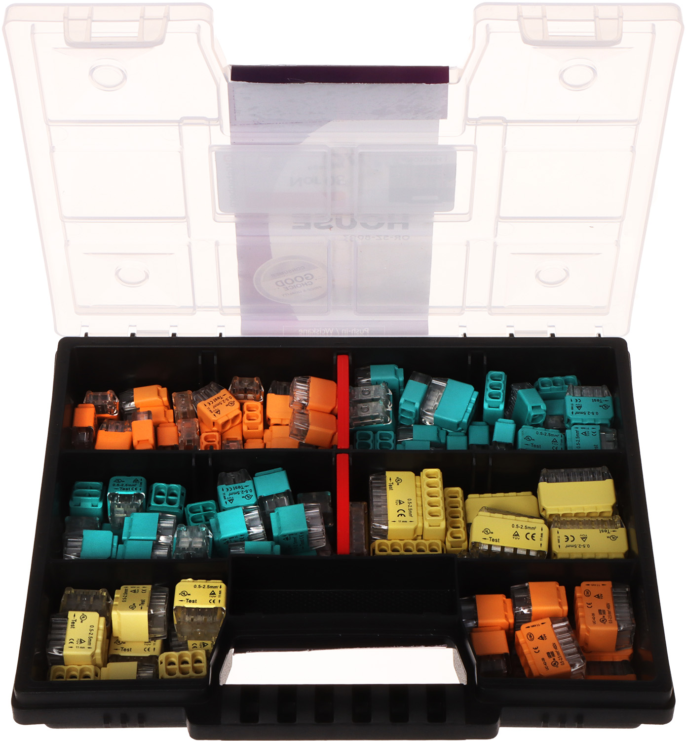 Connector type: Push-in connection </span>;>Contact material: 100 % Cu + Sn </span>;>Material of manufacture: PC + Nylon 66 </span>;>Number of pieces per package: 123 pieces. </span>;>Manufacturer / Brand: ORNO </span>;
