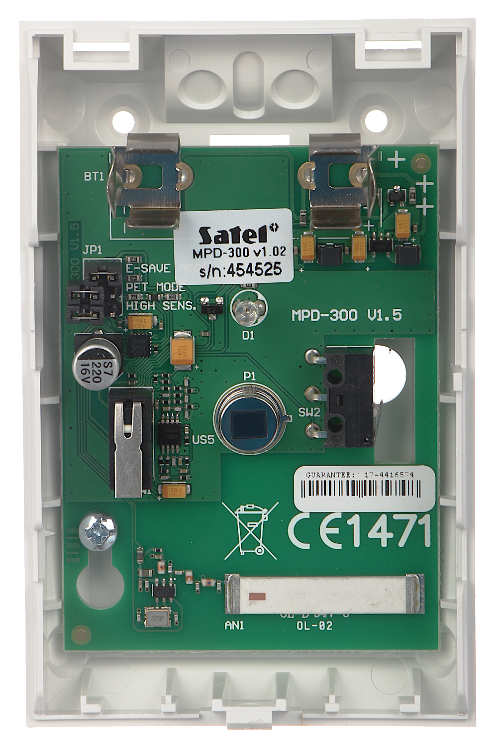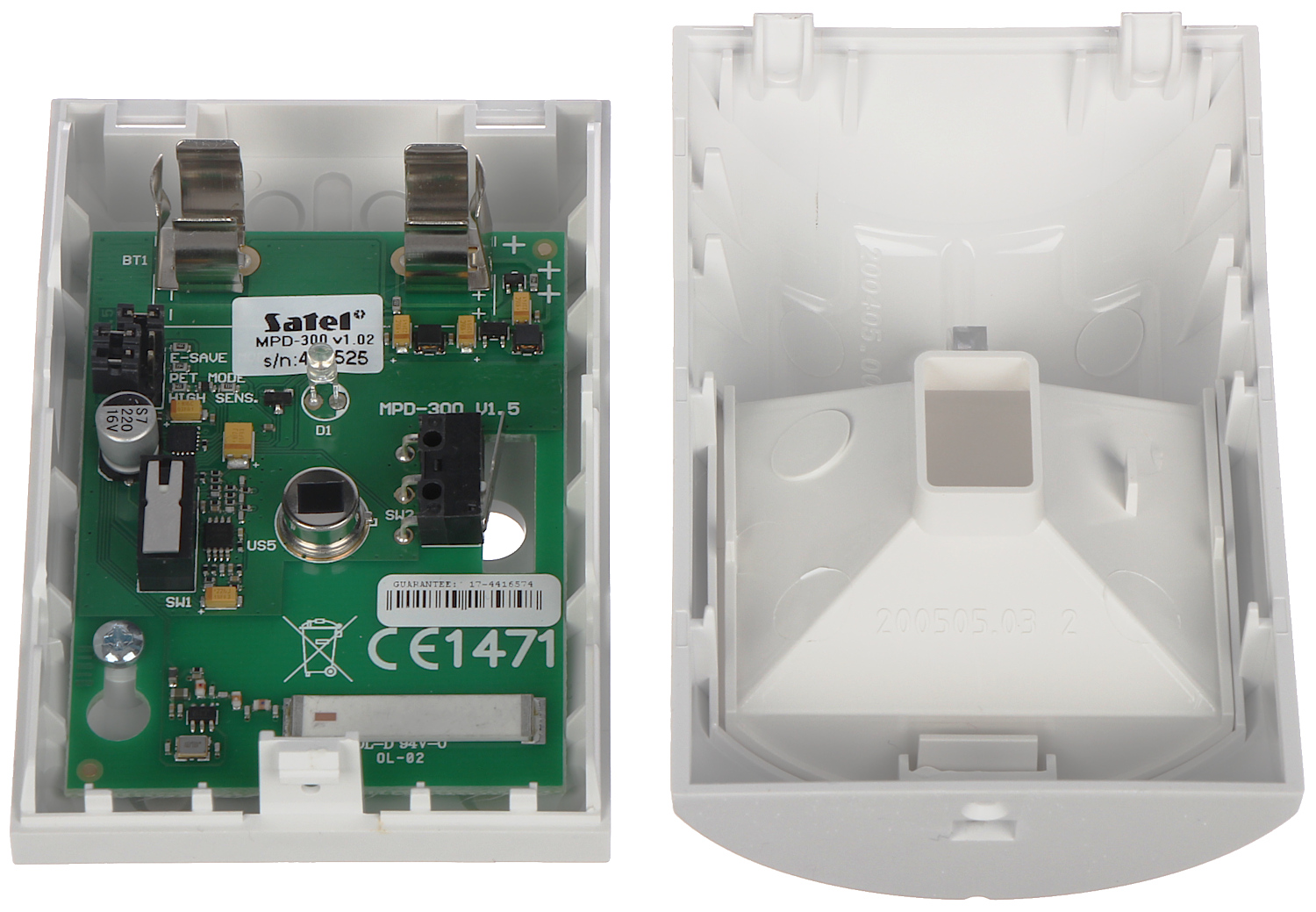 | Selected characteristics: | kustību noteikšanas digitālais algoritms ar temperatūras kompensāciju nodrošina augstu noturību pret viltus trauksmes signāliem un parametru atkārtojamību iespēja mainīt jutību, ļaujot optimāli pielāgot detektora parametrus aizsargājamajai vietai Maināmas Fresneļa lēcas Diode LED testa režīmā signalizē par pārkāpumu, atvieglojot sistēmas palaišanu un tālāku konservāciju Sabotāžas atklāšana – korpusa atvēršana, atraušana no pamatnes enerģijas pārvaldības sistēma nodrošina darbību daudzu gadu garumā, nenomainot litija bateriju CR123A |