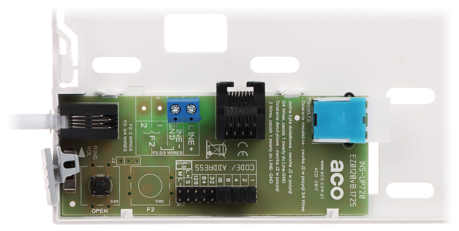 Compatibility: ACO CDNP, Inspiro, Familio P/PV </span>;>Installation type: Digitāla 2-dzīslu </span>;>Source of energy supply: 15 V DC, 250 mA (strāvas adapteris nav iekļauts komplektā) </span>;>Housing: Plastics </span>;>Colour: White </span>;