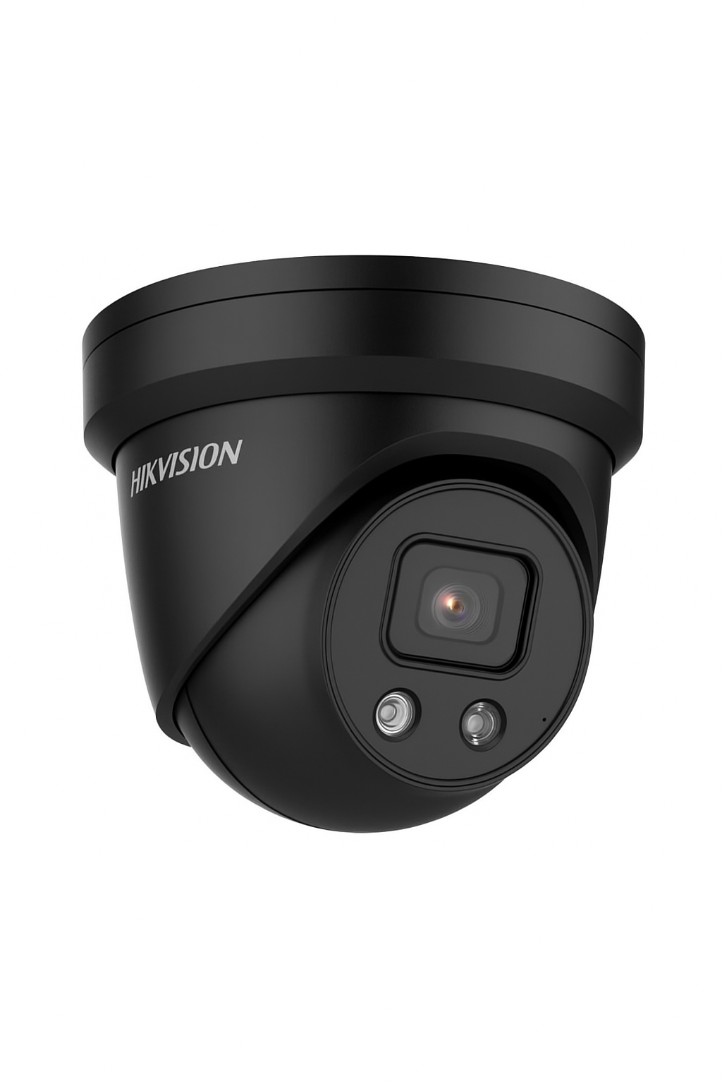 4 MP kupolveida IP kamera Hikvision DS-2CD2346G2-IU (melna) with AcuSense 2.0 analītiku, 2.8 mm objektīvu un uzlabotu cilvēku/transportlīdzekļu detekciju. Aprīkota ar mikrofonu, IR up to 30 m un H.265+ kodēšanu.