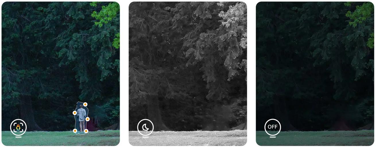 AOV PT offers various night vision modes to suit your needs. It can automatically switch to full color mode when a person is detected, providing a clear and bright image. You can also disable night mode or use only IR to reduce power consumption.