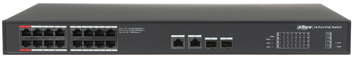 | Transmission speed: | 10 / 100 / 1000 Mbps – 16 x LAN & PoE porti, 10 / 100 / 1000 Mbps – 2 x Uplink porti, 1000 Mbps – 2 x SFP porti |