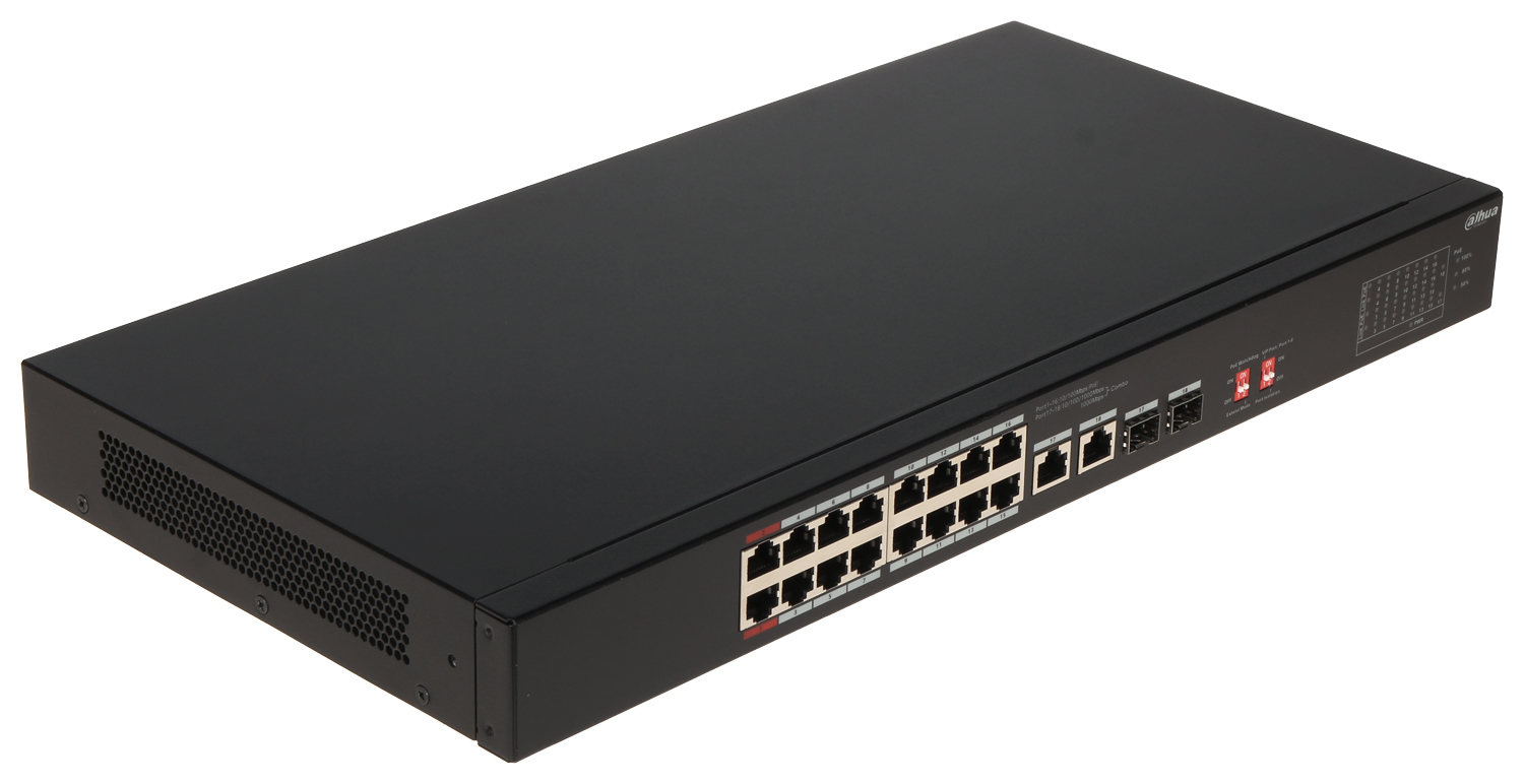 LAN ports: 16 x RJ45 ( 2 Hi-PoE (802.3bt) + 14 PoE (802.3af/at) ), 2 x Uplink ( RJ45 / SFP ligzda ) </span>;>Transmission speed: 10 / 100 Mbps – 16 x LAN & PoE porti, 10 / 100 / 1000 Mbps – 2 x Uplink porti / 1000 Mbps – 2 x SFP porti </span>;>Maximum total power: 135 W </span>;