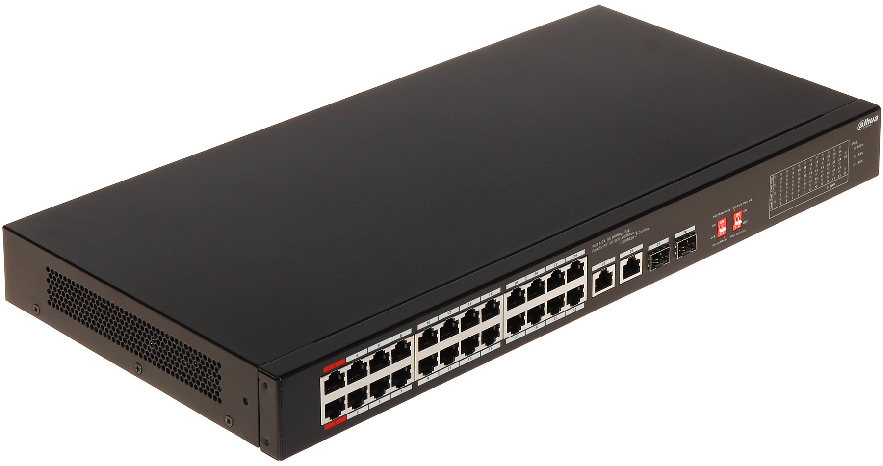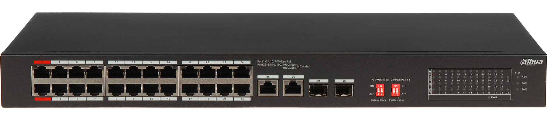 LAN ports: 26 x RJ45 ( 2 Hi-PoE + 24 PoE (802.3af/at) ), 2 x Uplink ( RJ45 / SFP ligzda ) </span>;>Transmission speed: 10 / 100 Mbps – 24 x LAN & PoE porti, 10 / 100 / 1000 Mbps – 2 x Uplink porti / 1000 Mbps – 2 x SFP porti </span>;>Maximum total power: 240 W </span>;