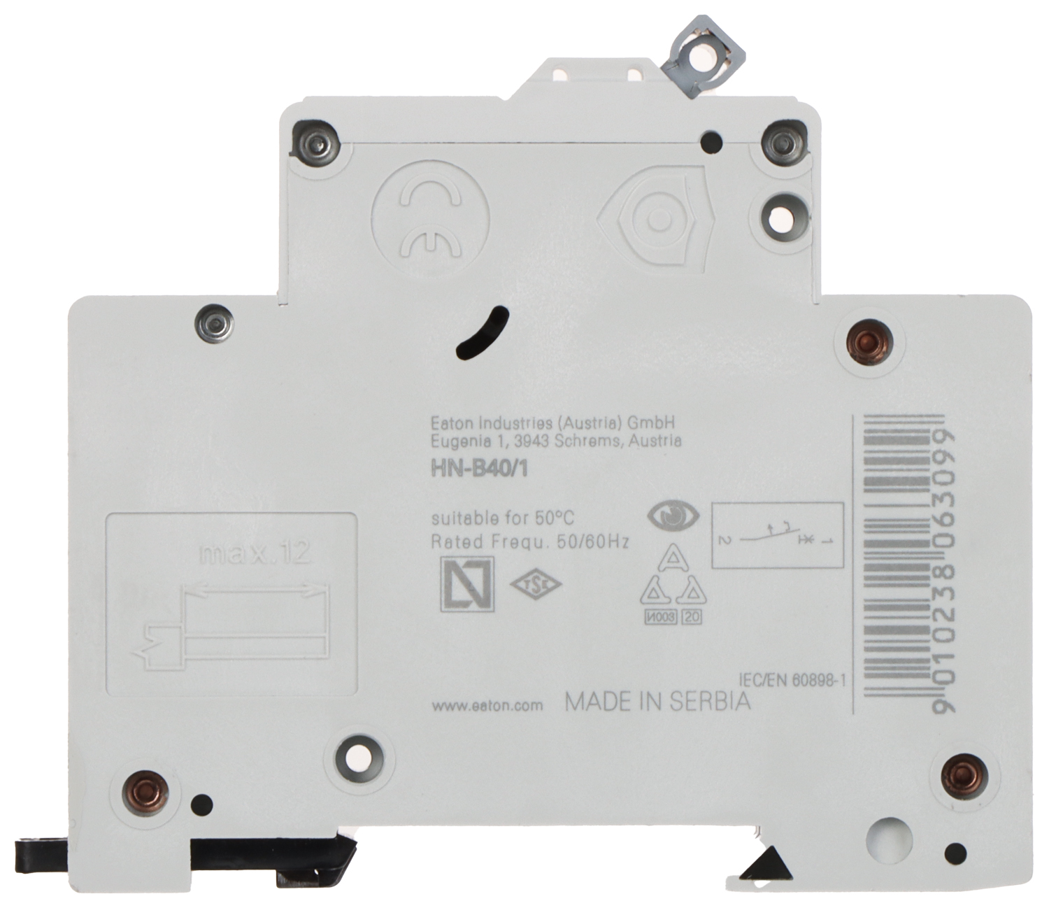 Device type: Power switch, Single phase </span>;>Rated current: 40 A </span>;>Number of poles: 1 </span>;>Trip characteristics: Type B </span>;>Unlocking capacity: 6000A </span>;>Connector type: screw plate </span>;>Lay cross-section: 1mm² – 25mm² </span>;>Housing: DIN rail mounting, TS-35 </span>;>Width in 17.5 mm modules: 1 </span>;