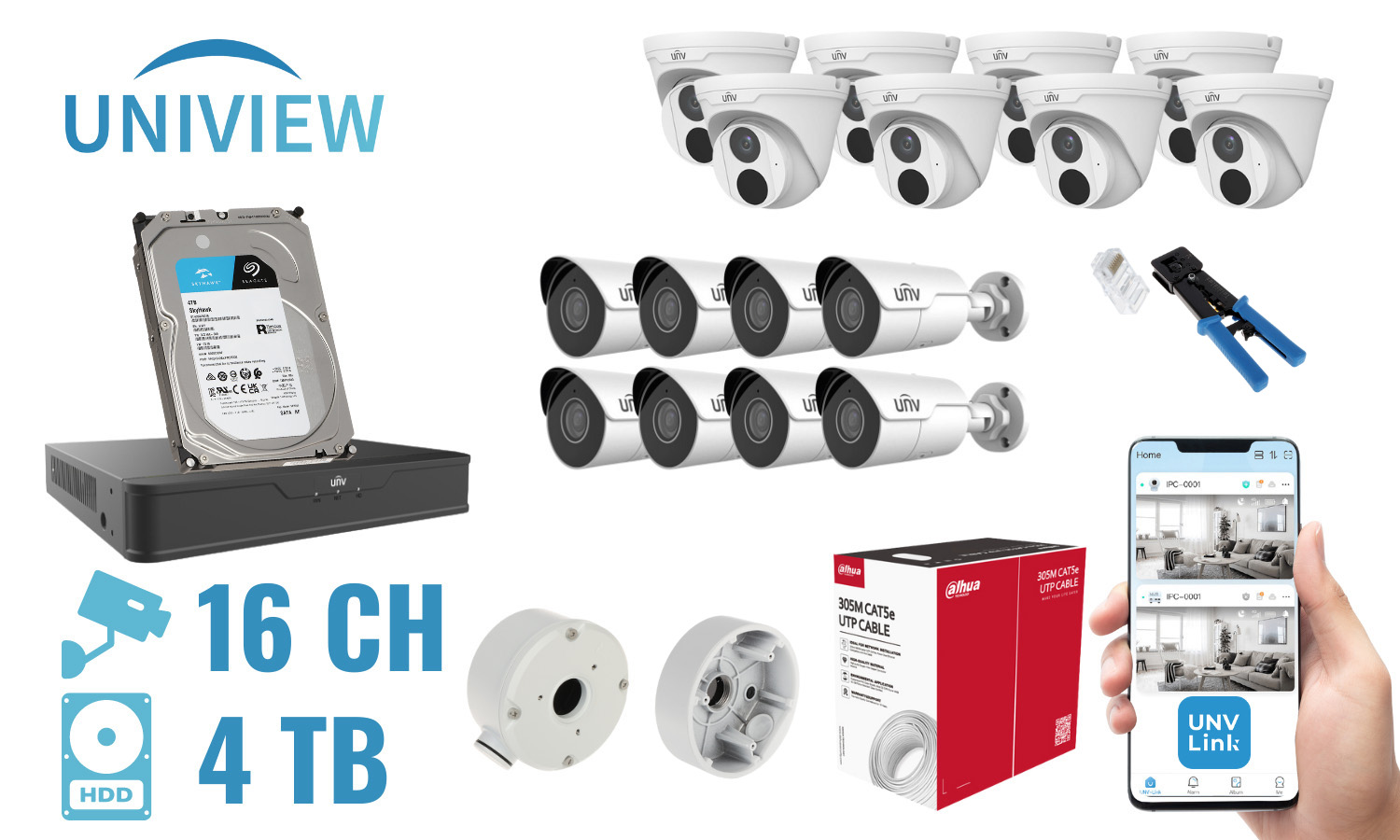 Komplektā ietilpst DVR, 4 TB cietais disks, 8 lodveida kameras, 8 kupolkameras, 305 m garš vītā pāra kabelis, RJ45 kontaktdakšu komplekts un presēšanas rīks; Supported resolution: max. 8.3 Mpx 4K UHD – 3840 x 2160 px </span>;>Image compression method: Ultra 265 </span>;>Designed for 24/7 operation</span>;>Standard: IP </span>; <table>