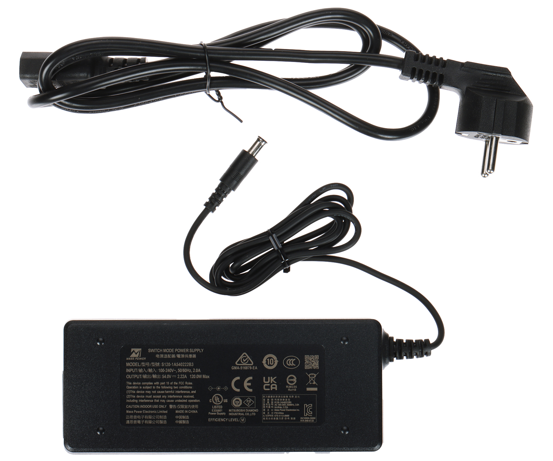 54 V DC / 2.22 A (komplektā strāvas adapteris)