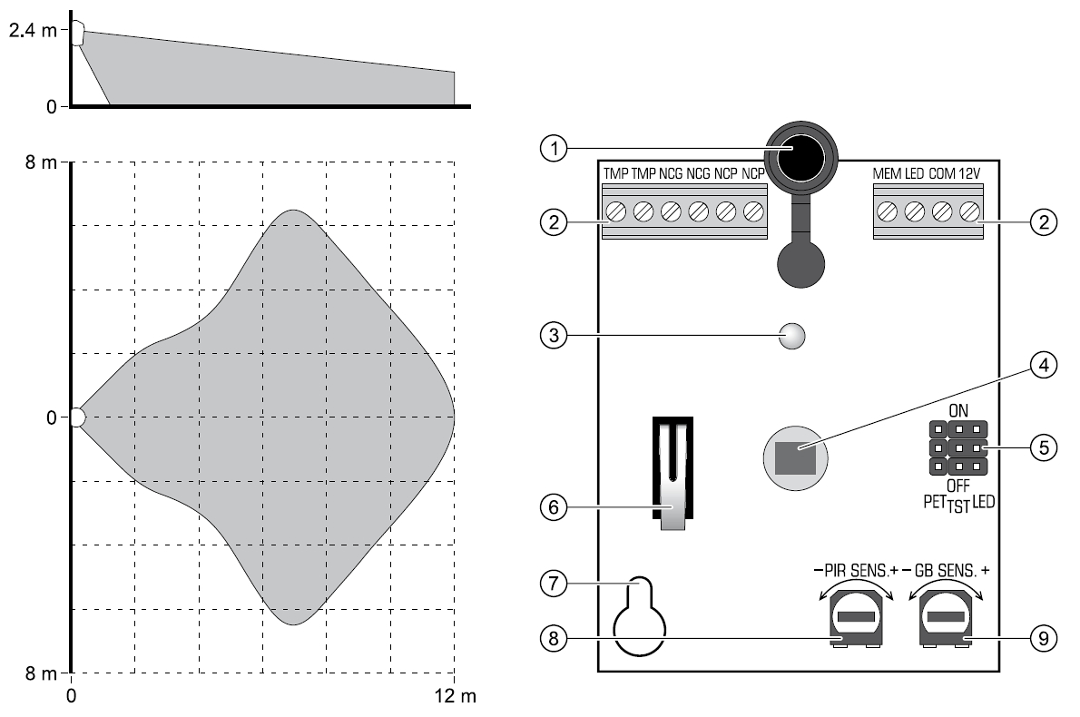 | Reception area: | 12 x 13 m – PIR detektors, 6 m – Stikla saplēšanas detektors |