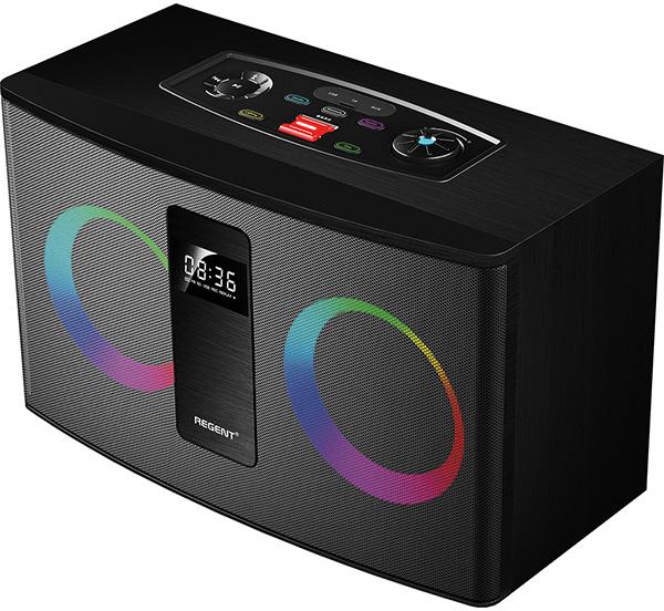 Regent Power Audio 300BT RGB FM ir jaudīgs skaļrunis, kuram varat pievienot tālruni vai citu audio avotu (izmantojot Bluetooth vai AUX ieeju) un aizpildīt vietu ar mūziku. Kompaktais, ar koku aizsargātais dizains ļauj palielināt skaļumu, neuztraucoties par lētiem skaļruņiem raksturīgiem lēcieniem vai vibrācijām. Stabilais un smagais korpuss lieliski tiek galā ar jaudīgiem basiem, kurus varat ieslēgt ar vienu pogu, aktivizējot Ultra Bass System funkciju. Neuztraucieties, skaļrunis nesāks “staigāt” pa virsu – tas lieliski tiks galā ar visu, ko tam liksiet darīt, vienlaikus piepildot telpu ar augstas kvalitātes skaņu.