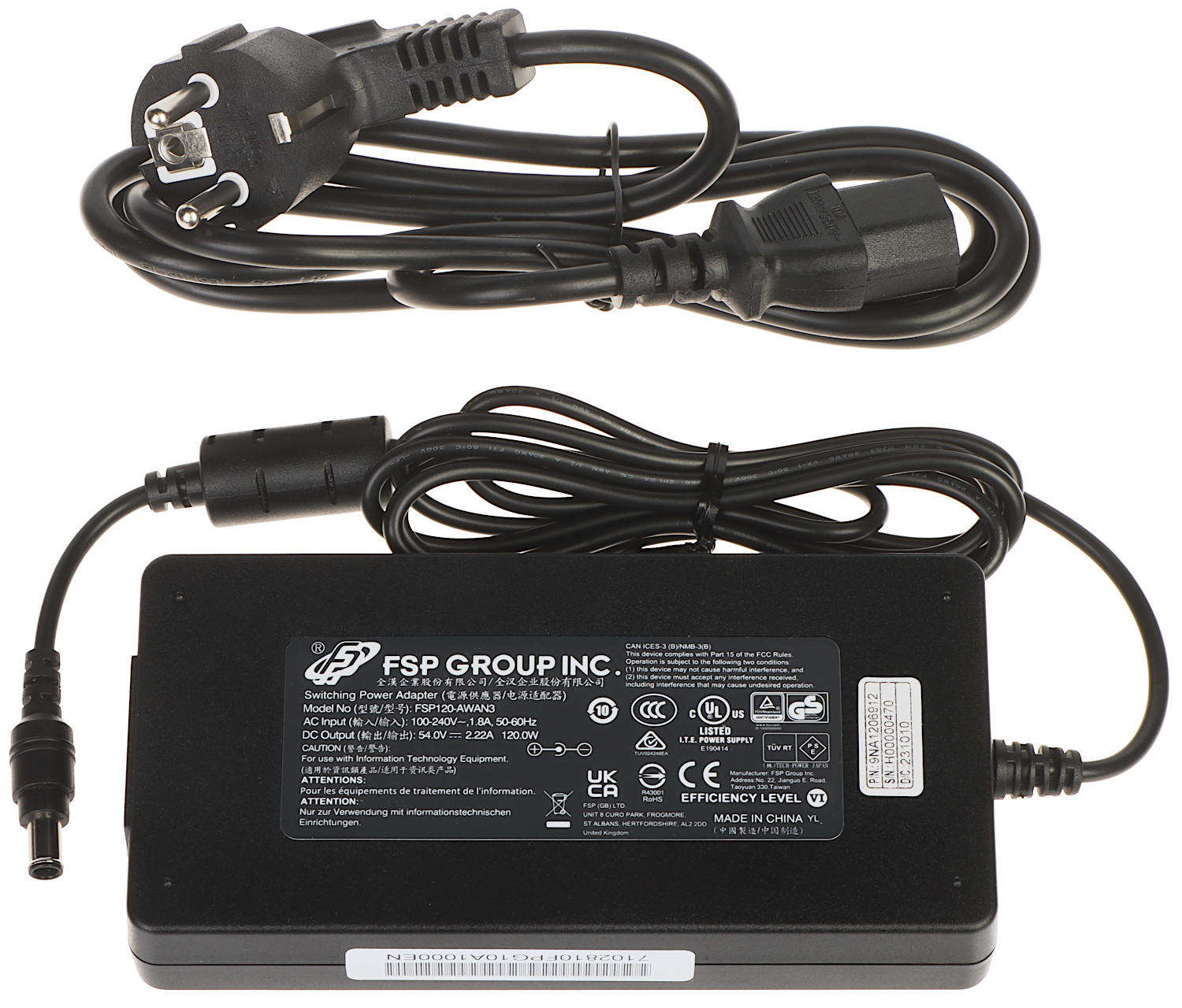 54 V DC / 2.22 A (komplektā strāvas adapteris)
