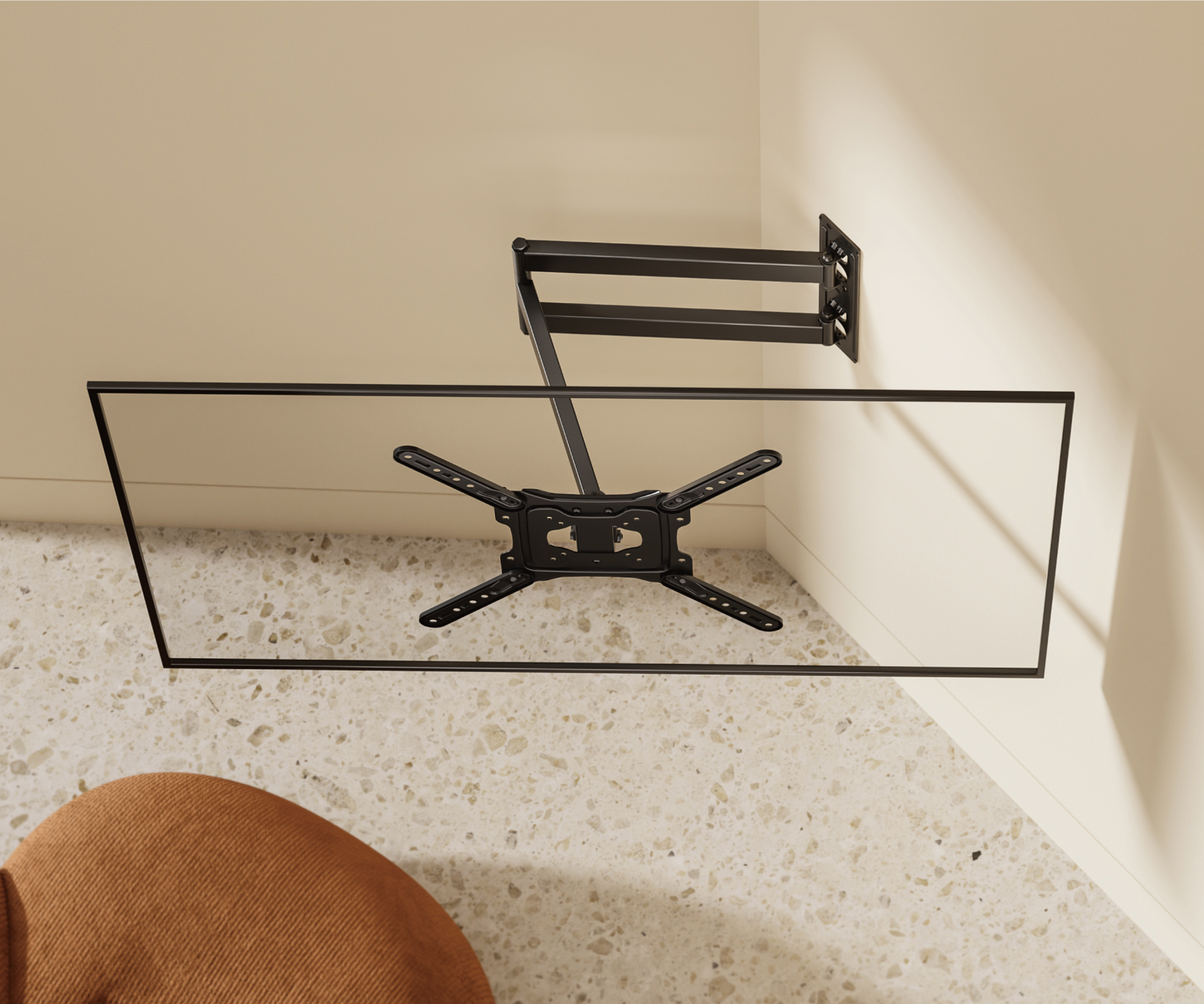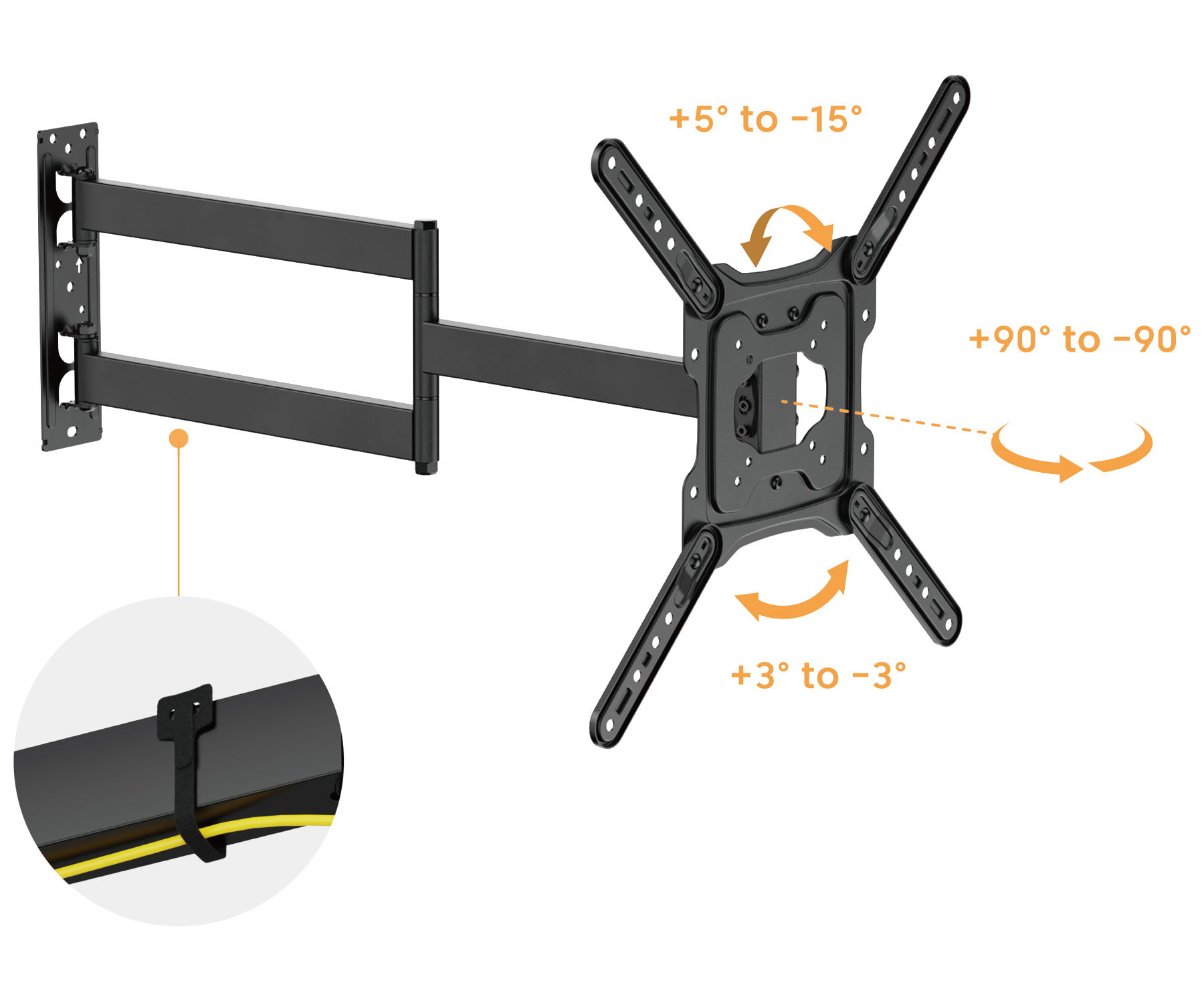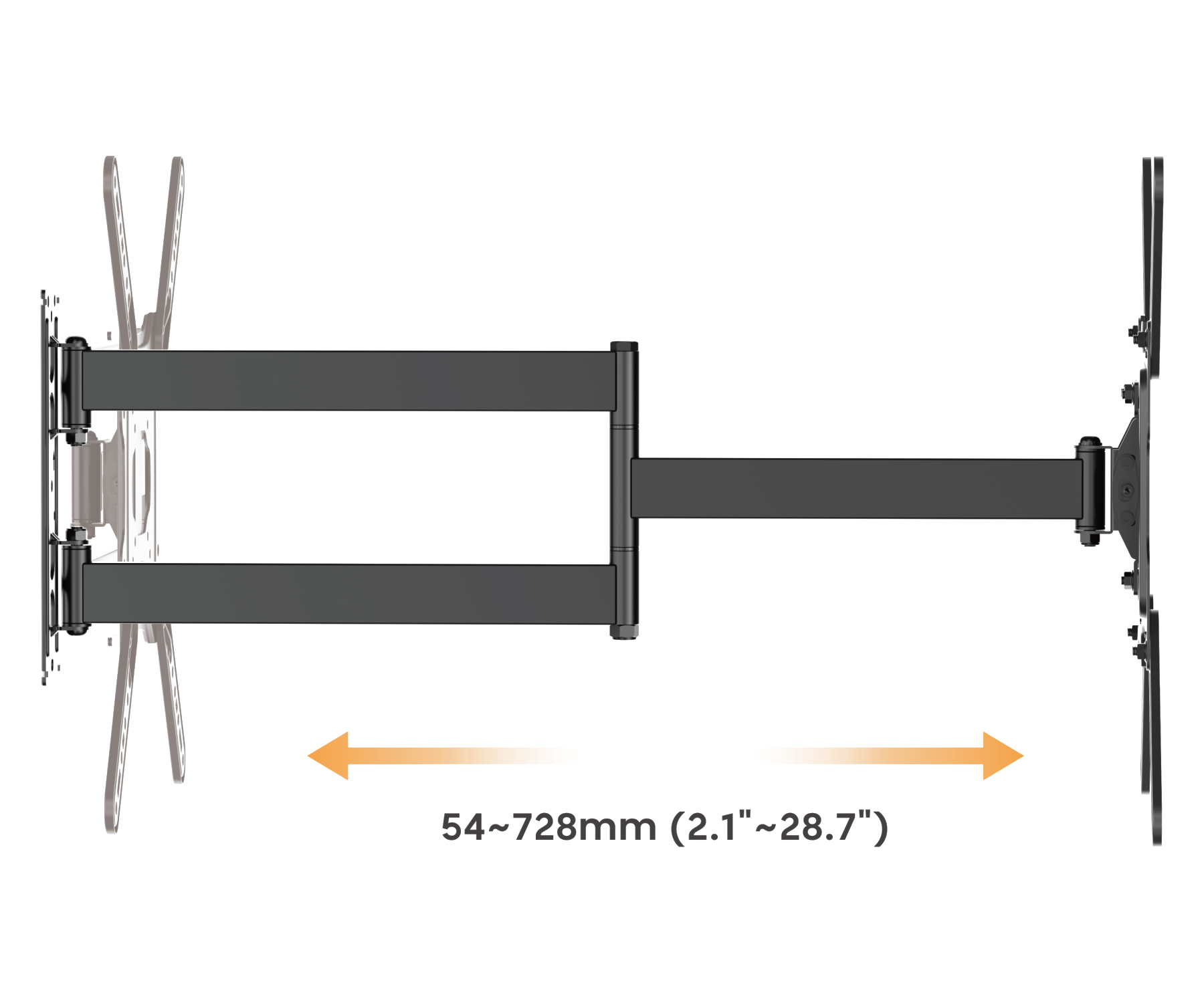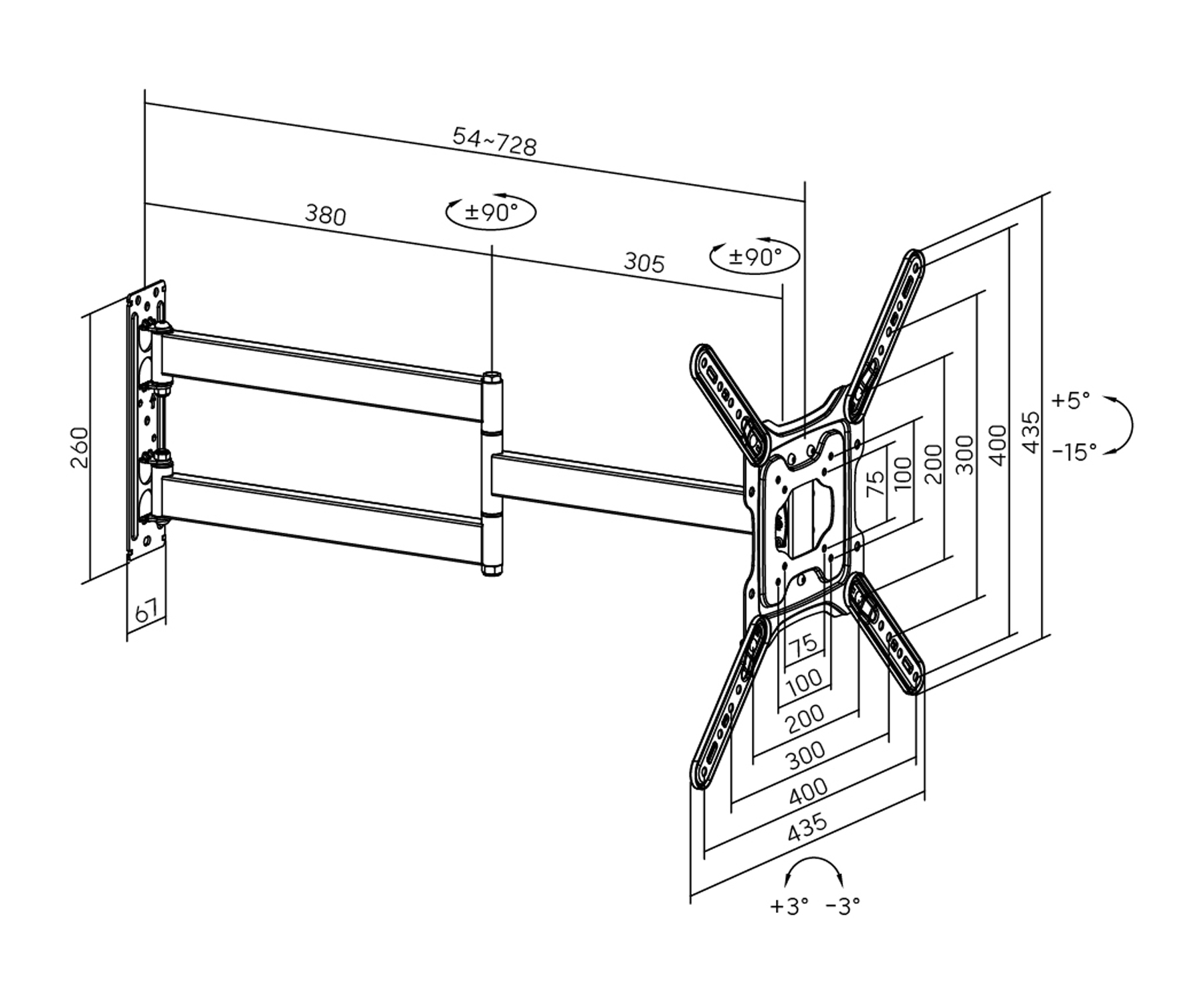 Assembly standard: VESA : 75×75, 100×100, 200×100, 200×200, 300×200, 400×200, 300×300, 400×300, 400×400 </span>;>Screen size in inches: 23 " … 65 " </span>;>Load capacity: 35 kg </span>;>Distance from mounting surface: 54 … 728 mm </span>;>Vertical slope: -15 ° … 5 ° </span>;>Horizontal rotation: -90°…90° </span>;