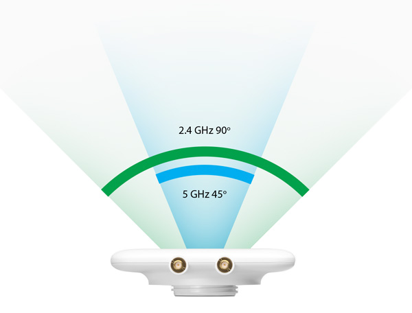Enerģijas pieaugums ir 10 dBi in the 2.4 GHz band and 15 dBi 5 GHz joslā, savukārt galvenais staru kūļa platums ir 90° in the 2.4 GHz band and 45° .5 GHz joslā. Antena atbalsta dubulto polarizāciju (2×2 MIMO), horizontālo un vertikālo.