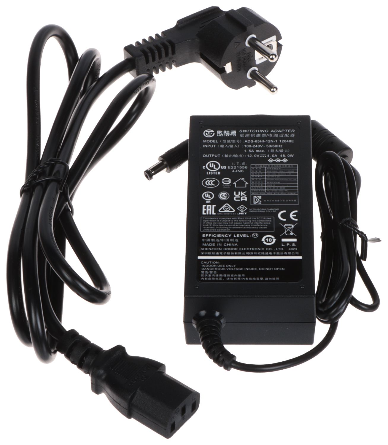 12 V DC / 4 A (komplektā strāvas adapteris) ,