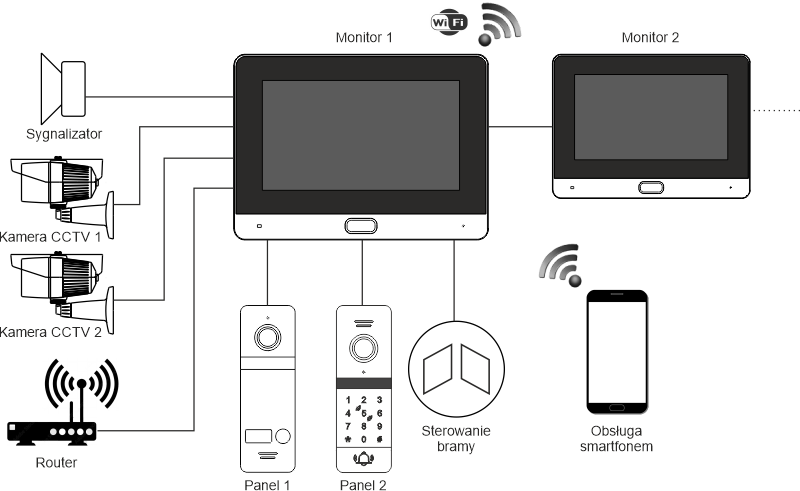 - built-in WiFi network card – cooperation with smartphones (Android, iOS system) – receiving calls, opening entrances, viewing images from panels and surveillance cameras