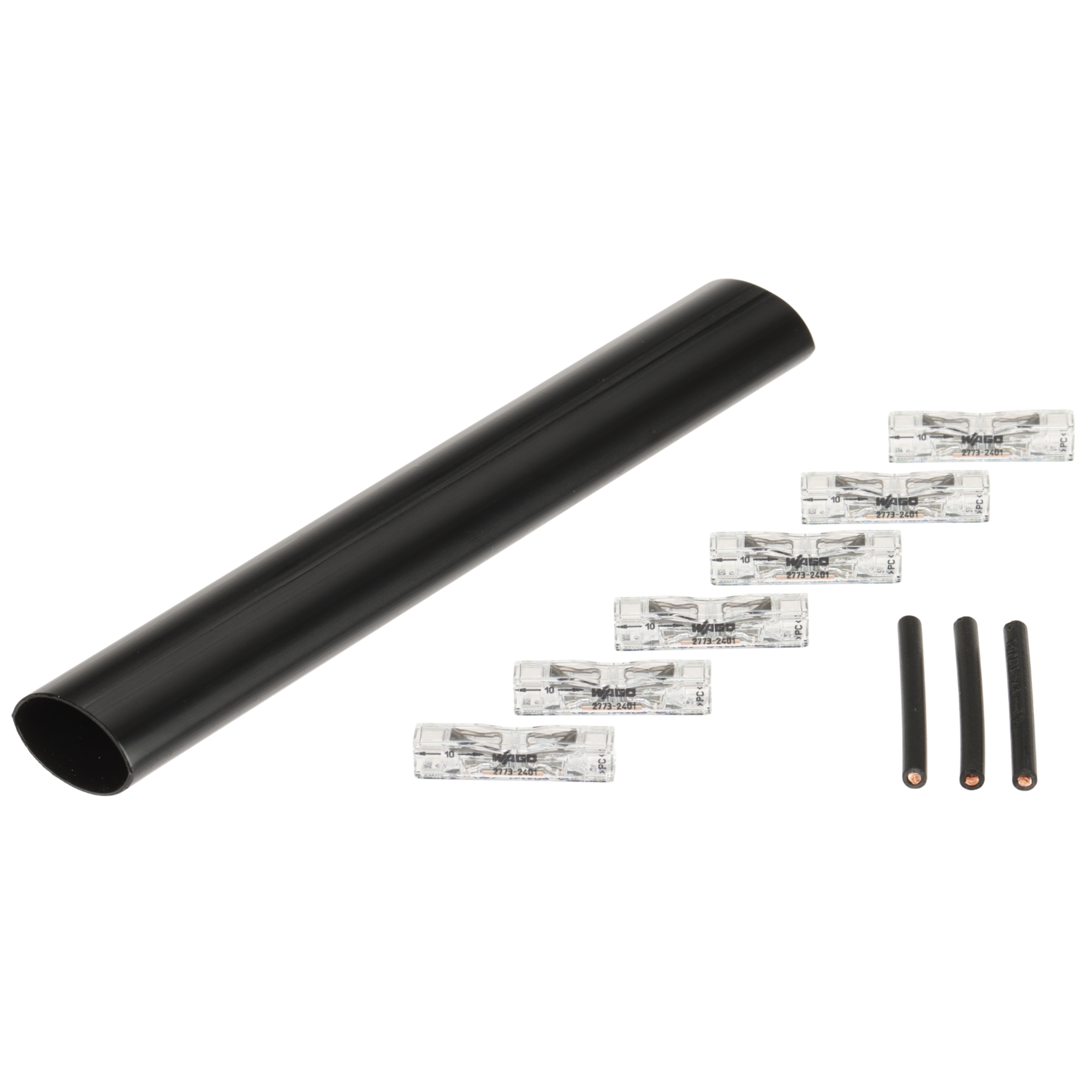 Bojātu kabeļu remonta komplekts ar WAGO montāžas piederumiem; Komplektā ir seši WAGO-2773-2401 ātrdarbīgie savienotāji, trīs 4 mm² viendzīslas vadi ar 4 cm garumu un termiski saraucama līmes caurule ar 17 mm diametru un 16 cm garumu.; Rakendus: Laido skerspjūvis : 1, 1.5, 2.5, 4 mm²