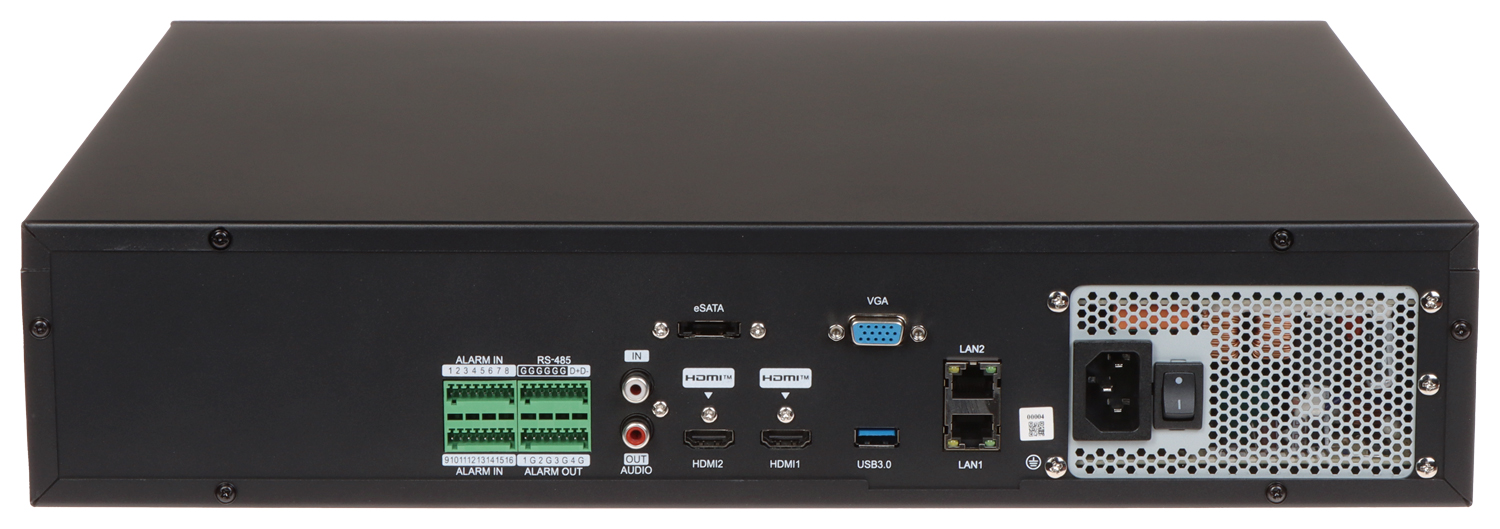 Toetatud resolutsioon: max 12 megapikslit - 4000 x 3000 pikslit </span>;>Heli tugi: 32 kanalit, vastab AAC standardile </span>;>Pildi tihendamise meetod: H.265+ </span>;>Toetatud kõvakettad: 8 x 10 TB SATA + 1 x eSATA </span>;>Häire sisendid/väljundid: 16 / 4 </span>;