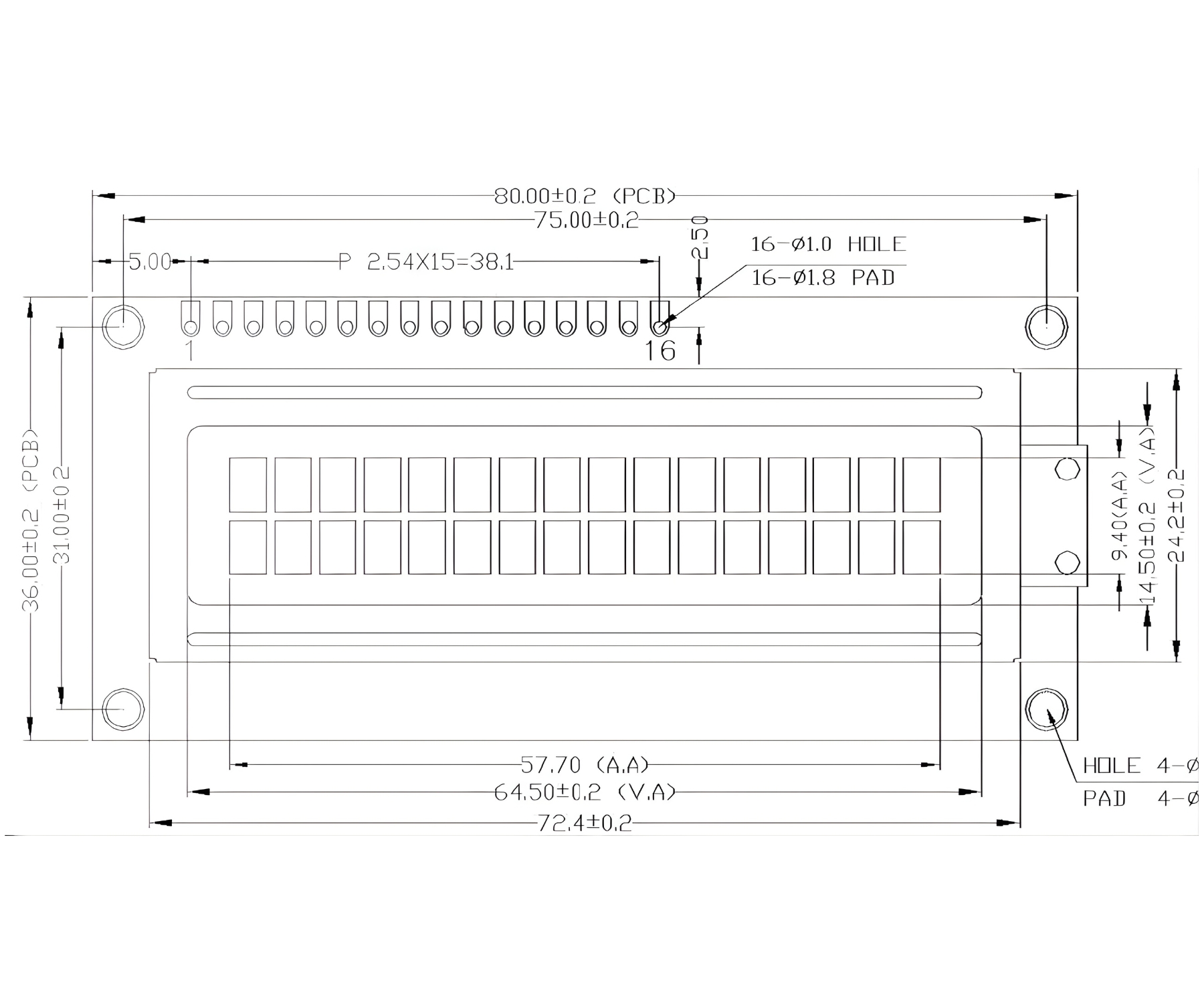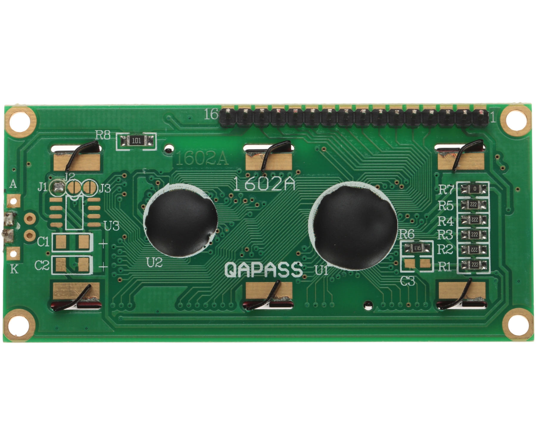 Alfanumeriskais LCD displejs, ko izstrādājis justPi. Tas attēlo vērtības divās rindās pa 16 rakstzīmēm katrā. To darbina 5 V strāva. To raksturo ļoti vienkārša darbība, augsta pieejamība un daudzu mikrokontrolleru atbalsts. Rakstzīmes tiek attēlotas uz zaļa fona. Modulim ir pielodēti nepieciešamie savienotāji, lai to varētu pievienot Arduino.;