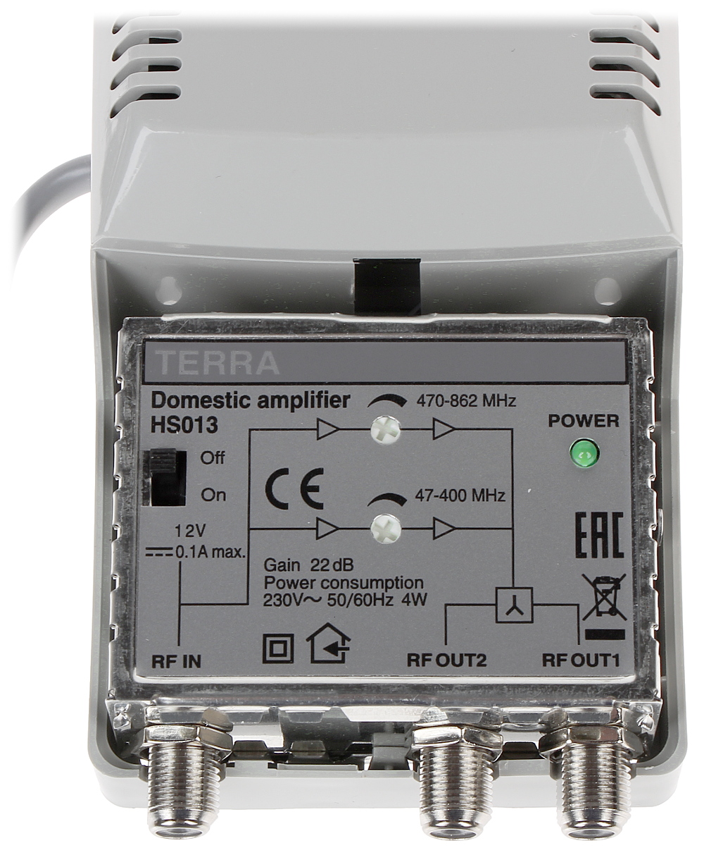 | Įtampos siuntimas į antenos viduje sumontuotus pirminius stiprintuvus: | 12 V / 100 mA (perjungimo jungiklis) |