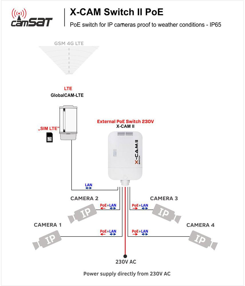 SWITCH POE CAMSAT X-CAM II jungiklis PoE+ 4F TX15 (230V, TX1550, RX1310)