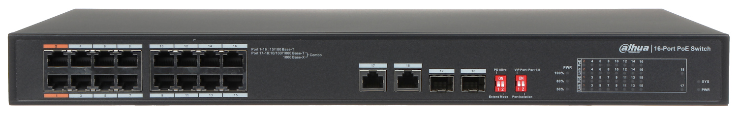 | LAN prievadai: | 16 x RJ45 (2 Hi-PoE + 14 PoE (802.3af/at) – 10/100 Base-T ), 2 x Uplink (RJ45 – 10/100/1000 Base-T / SFP lizdas   Base-T / SFP lizdas  ) |