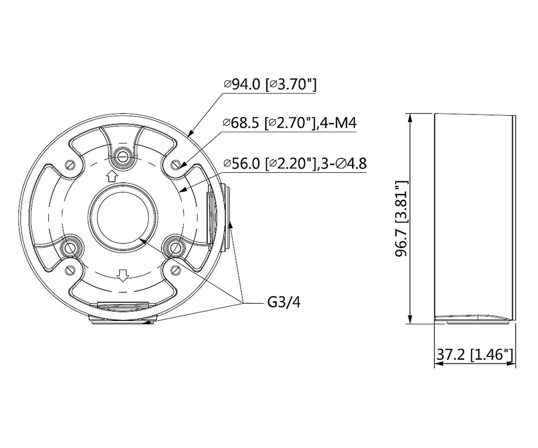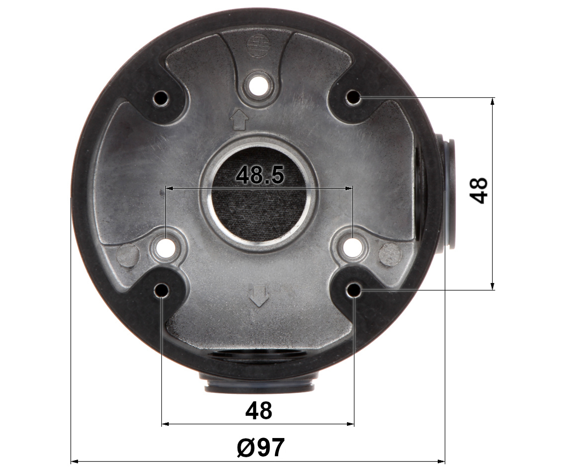 Montavimo angų išdėstymas: 48 x 48 mm </span>;>Atidarymų skaičius: 4 </span>;>Tvirtinimo detalės skersmuo: Ø 97 mm </span>;>Medžiaga: Aliuminis </span>;>Spalva: Juoda </span>;>Atstumas nuo tvirtinimo paviršiaus: 38 mm </span>;