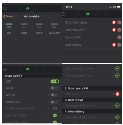 vaizdo vaizde rodoma informacija apie: aliarmo įvykį, akumuliatoriaus būseną ir įtampą, įkrovimą, manipuliavimą, LTE signalo kokybę.