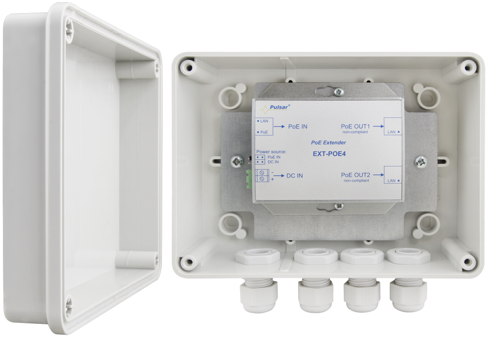 POE PAPLAŠINĀTĀJS (ĀRĒJAIS 48 V) PULSAR EXT-POE4H HERMĒTISKĀ KORPUSĀ 2 IP KAMEROM