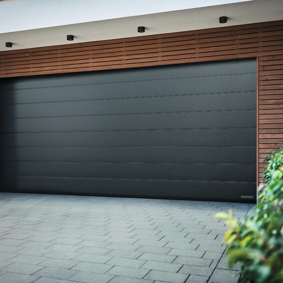 Pilnai įrengti garsios vokiečių firmos Hormann garažo vartai, modelis Renomatic. Pilni segmentai, kurių storis 42 mm, garantuoja aukštą šilumos izoliaciją, gerą stabilumą ir tylų vartų veikimą. Visi vartų paviršiai viduje yra padengti aukštos kokybės RAL 9002 (baltai pilka) danga, kuri garantuoja efektyvią apsaugą nuo korozijos.