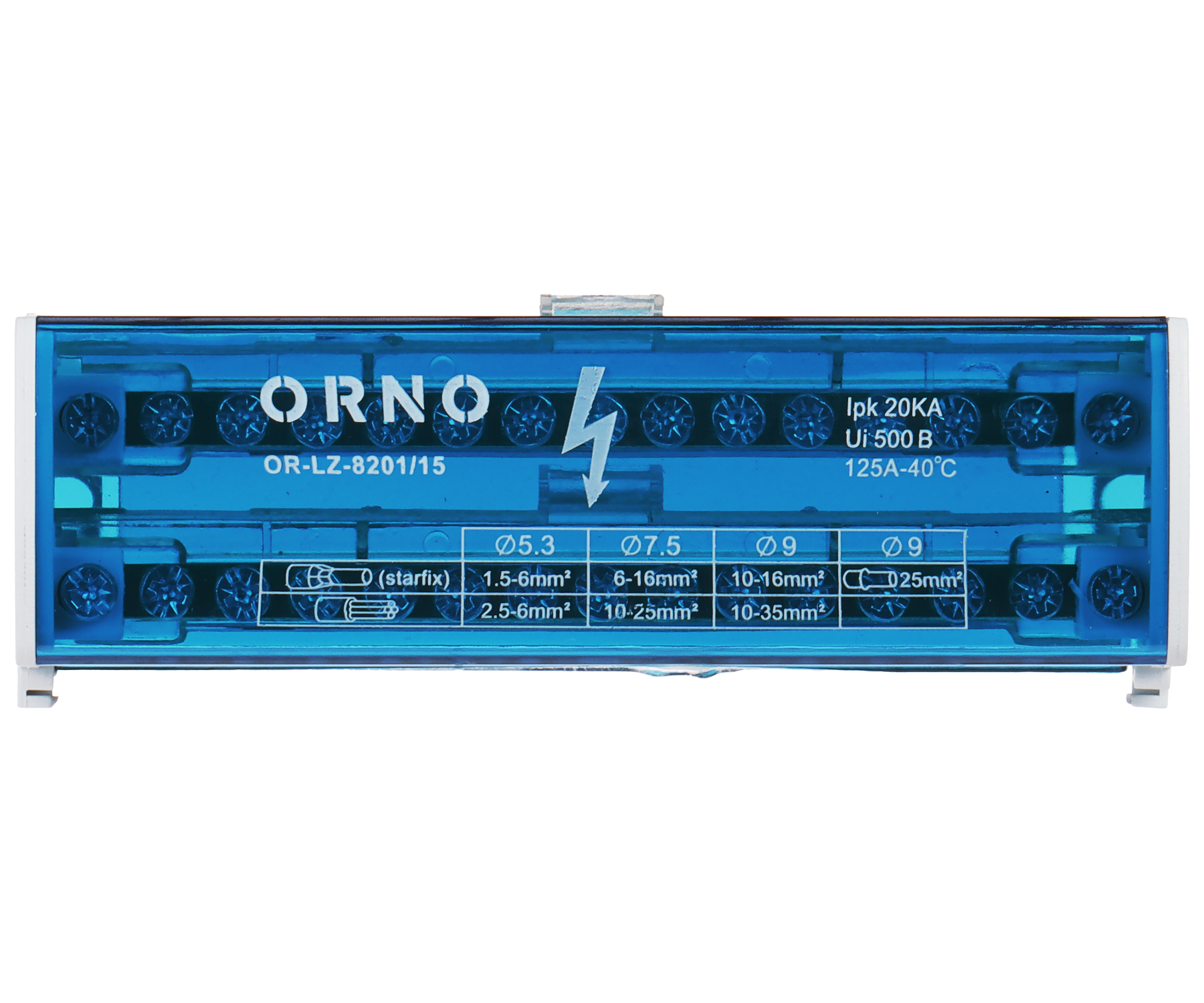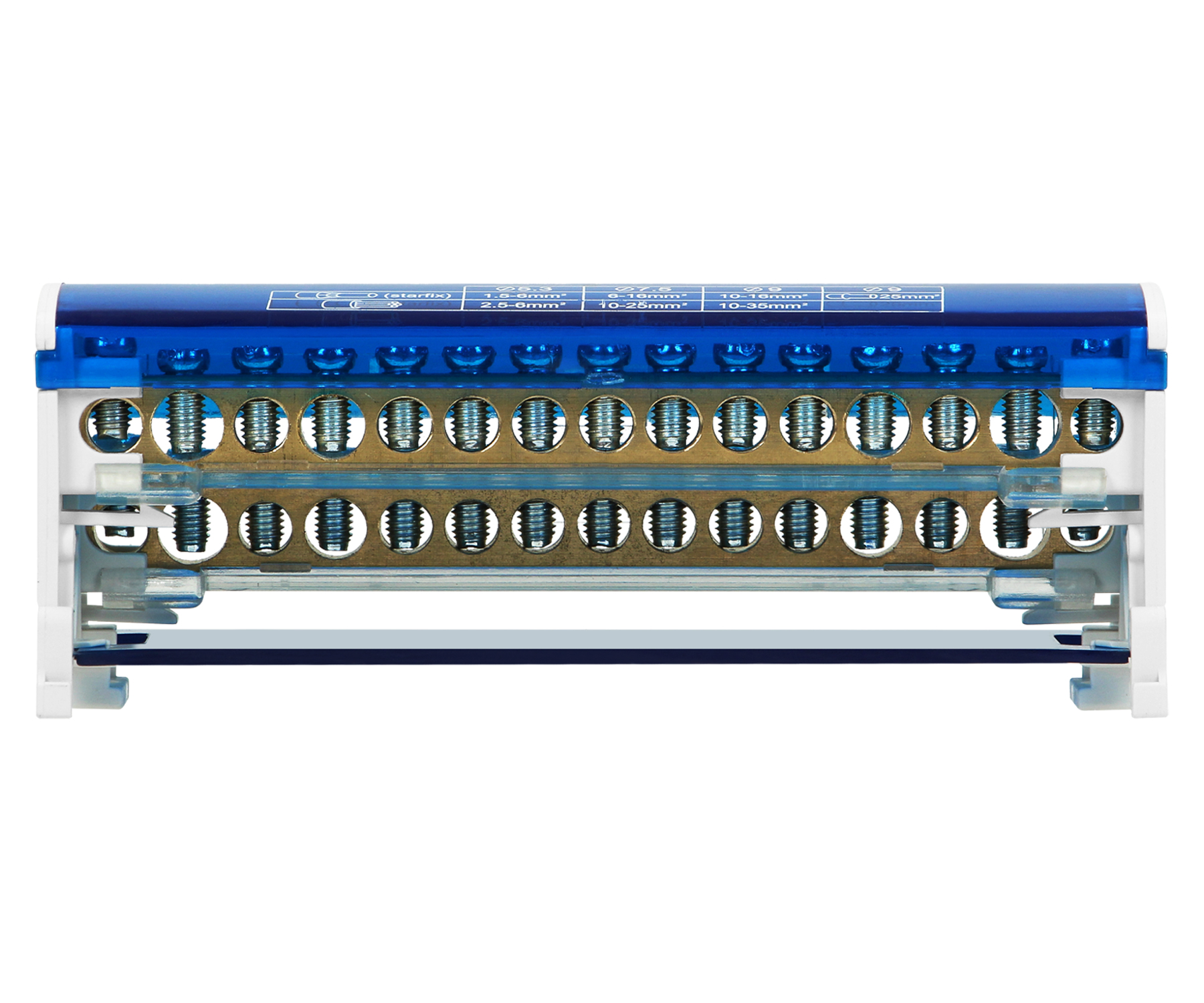 15 katrā joslā : 11 x 1.5 mm² … 6 mm² (ar kabeļu buksēm) / 2.5 mm² … 6 mm² (kabelis bez uzmavas) 2 x 6 mm² … 16 mm² (ar kabeļu buksēm) / 10 mm² … 25 mm² (kabelis bez uzmavas) 2 x 25 mm² (ar kabeļu buksēm) |