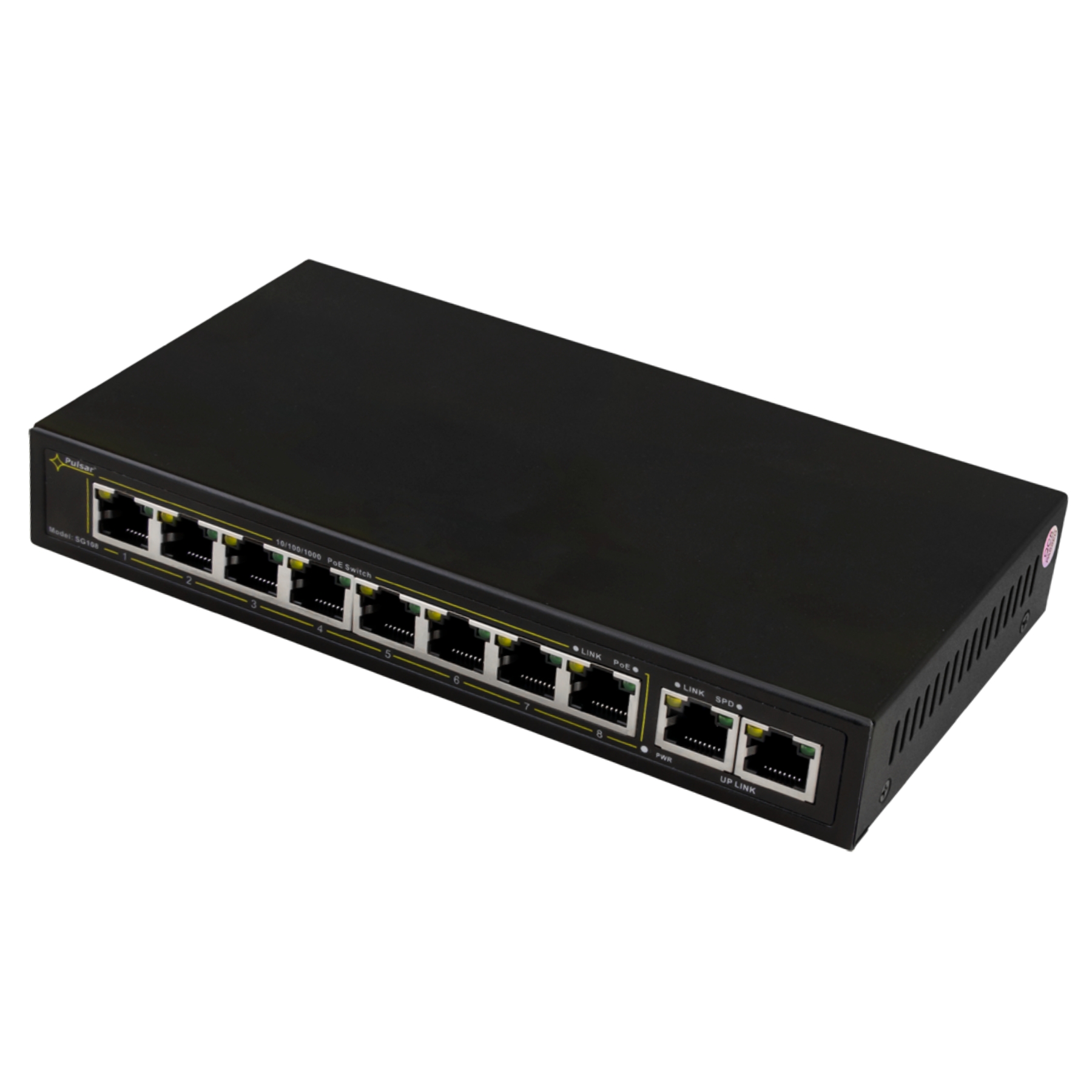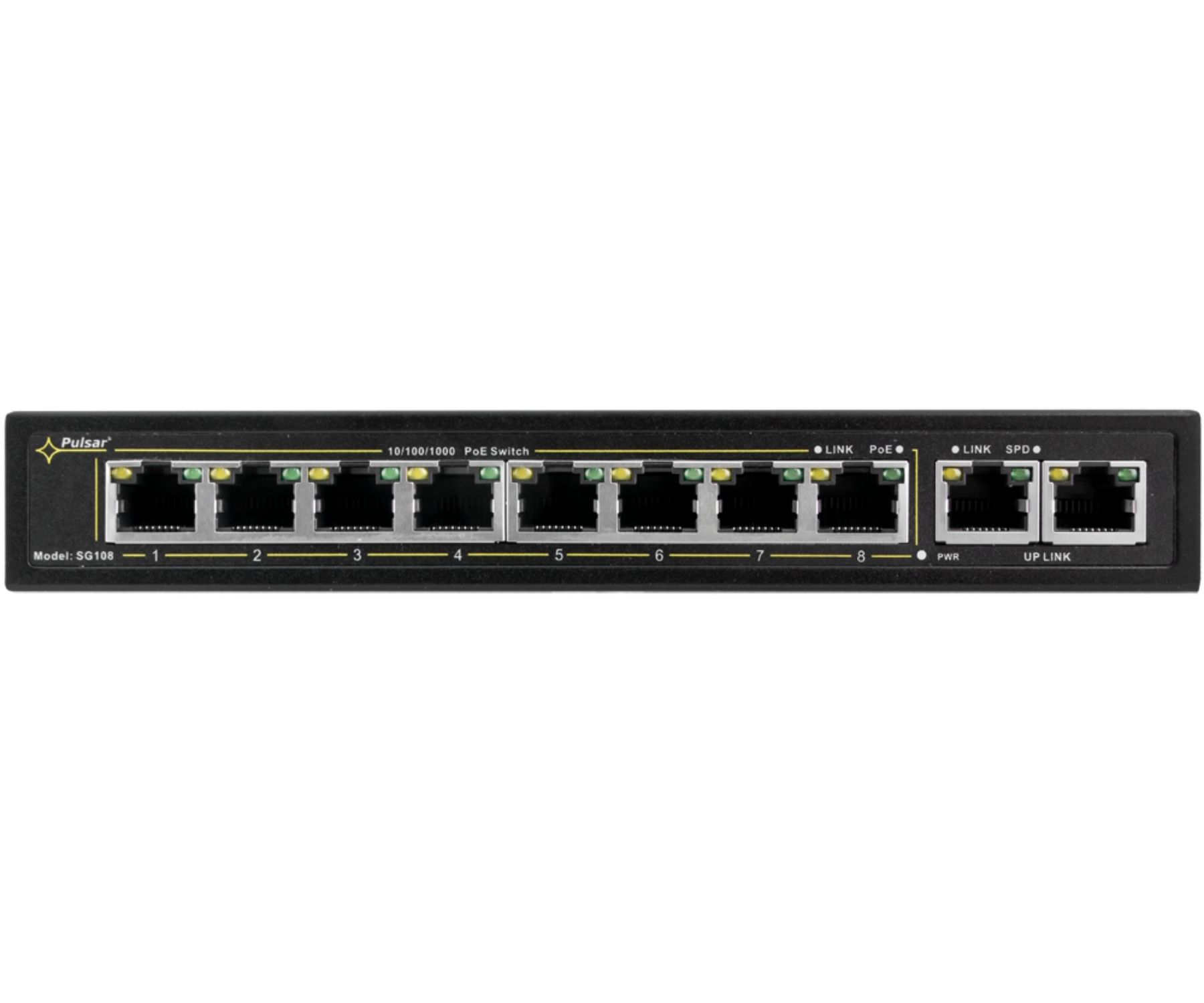LAN prievadai: 8 x RJ45 10/100/1000 Mbps – PoE (802.3af/at), 2 x RJ45 10/100/1000 Mbps – Uplink porti Perdavimo greitis: 10 / 100 / 1000 Mbps – 8 LAN & PoE porti, 10 / 100 / 1000 Mbps – 2 Uplink porti Maksimali bendra galia: 96 W