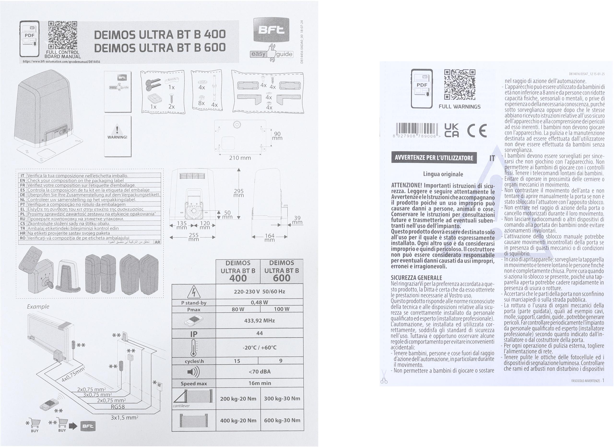 BFT DEIMOS ULTRA BT B600 INT KOMPLEKTS 600 kg bīdāmajiem vārtiem
