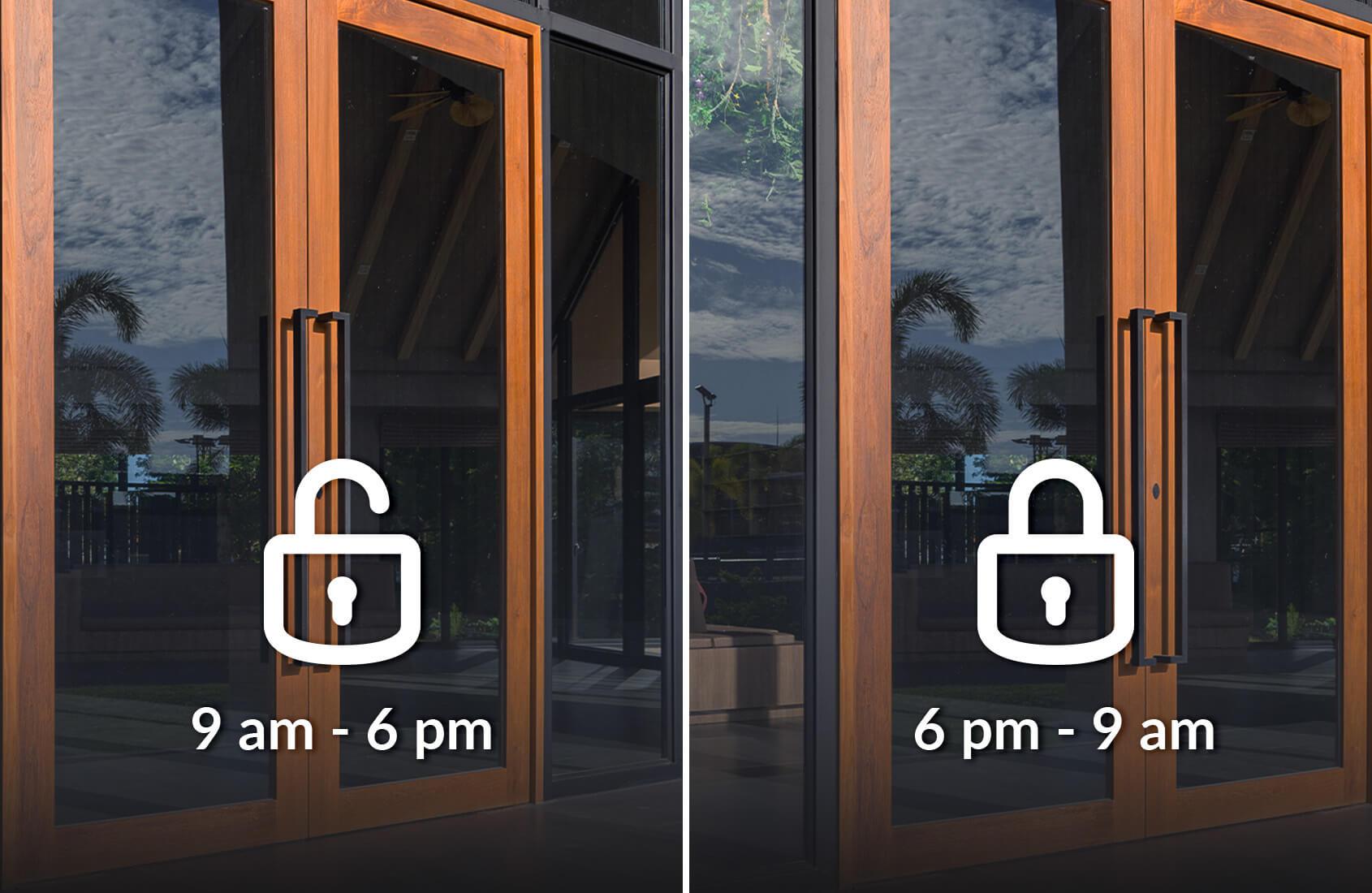 - Elektriskajai slēdzenei, kas pielāgota nepārtrauktai darbībai, kontrolieris var atvērt un uzturēt atvērtu stāvokli un pēc tam aizvērt izvēlētajā laikā vai diennakts laikā.