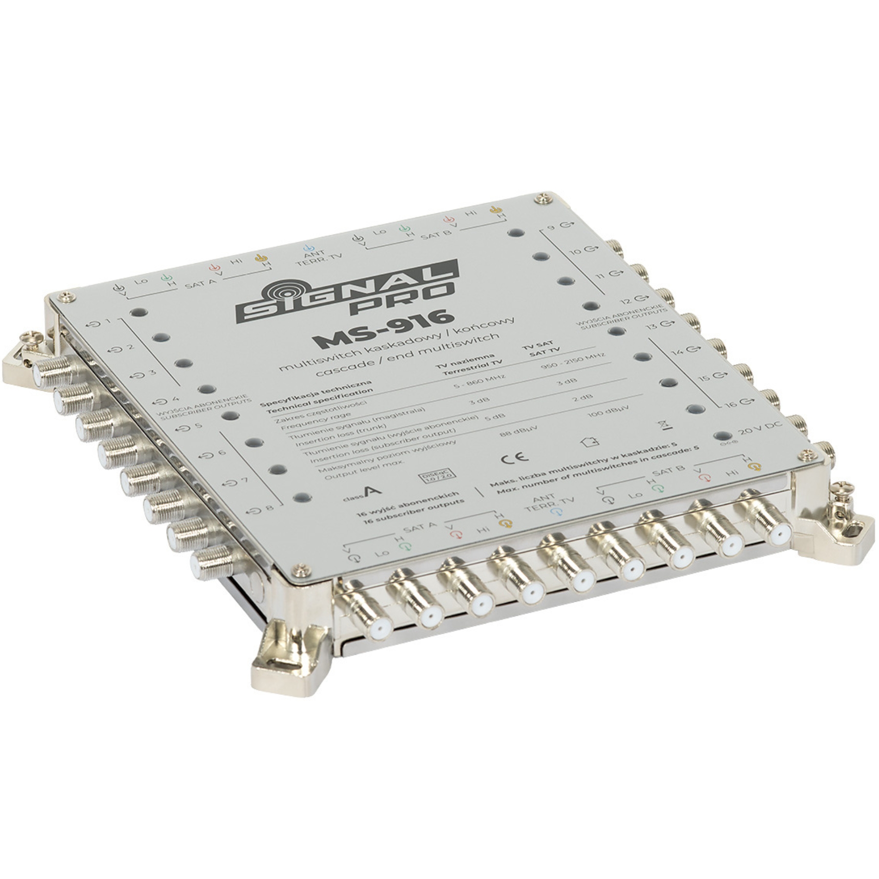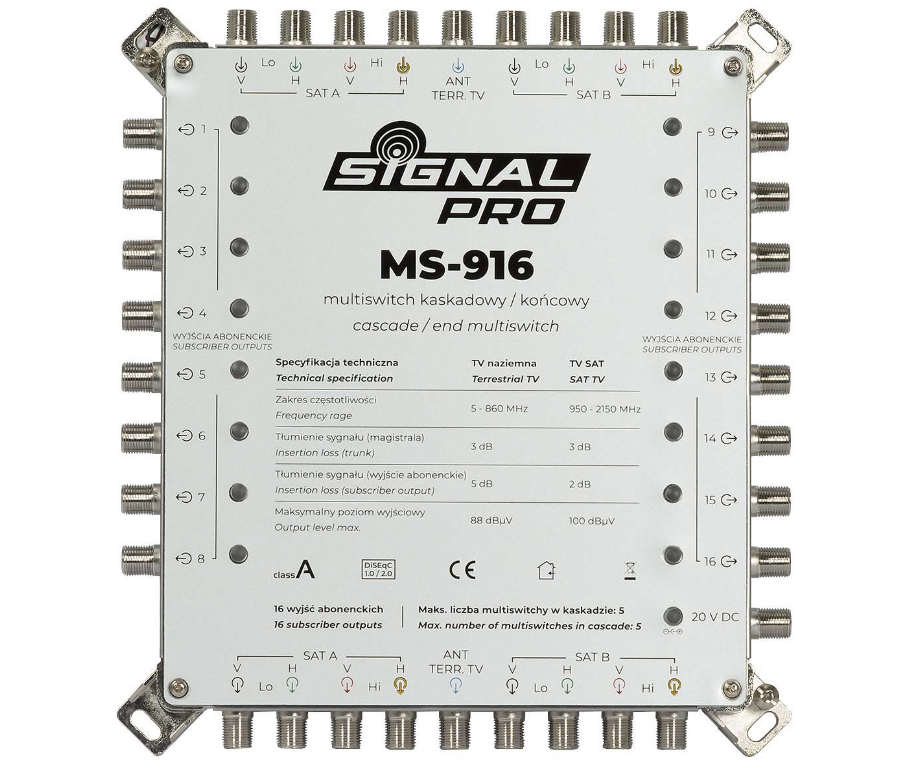 Ieejas: 8 x 950 MHz … 2150 MHz, 1 x 5 MHz … 860 MHz Izejas: 16 x 47 MHz … 2150 MHz, 9 (Signāla pāreja) Pārslēgšanas signāli: 13 V / 18 V, 0 Hz / 22 kHz, DiSEqC 1.0, DiSEqC 2.0