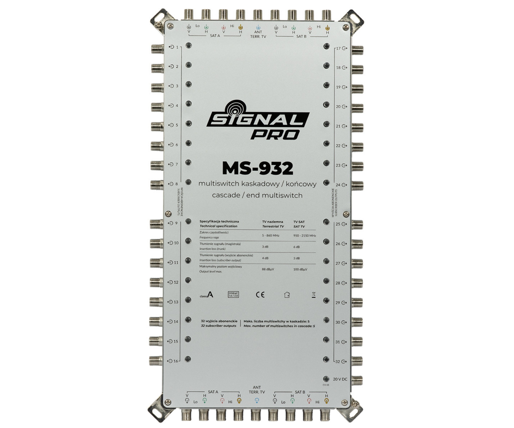 Ieejas: 8 x 950 MHz … 2150 MHz, 1 x 5 MHz … 860 MHz Izejas: 32 x 47 MHz … 2150 MHz, 9 (Signāla pāreja) Pārslēgšanas signāli: 13 V / 18 V, 0 Hz / 22 kHz, DiSEqC 1.0, DiSEqC 2.0