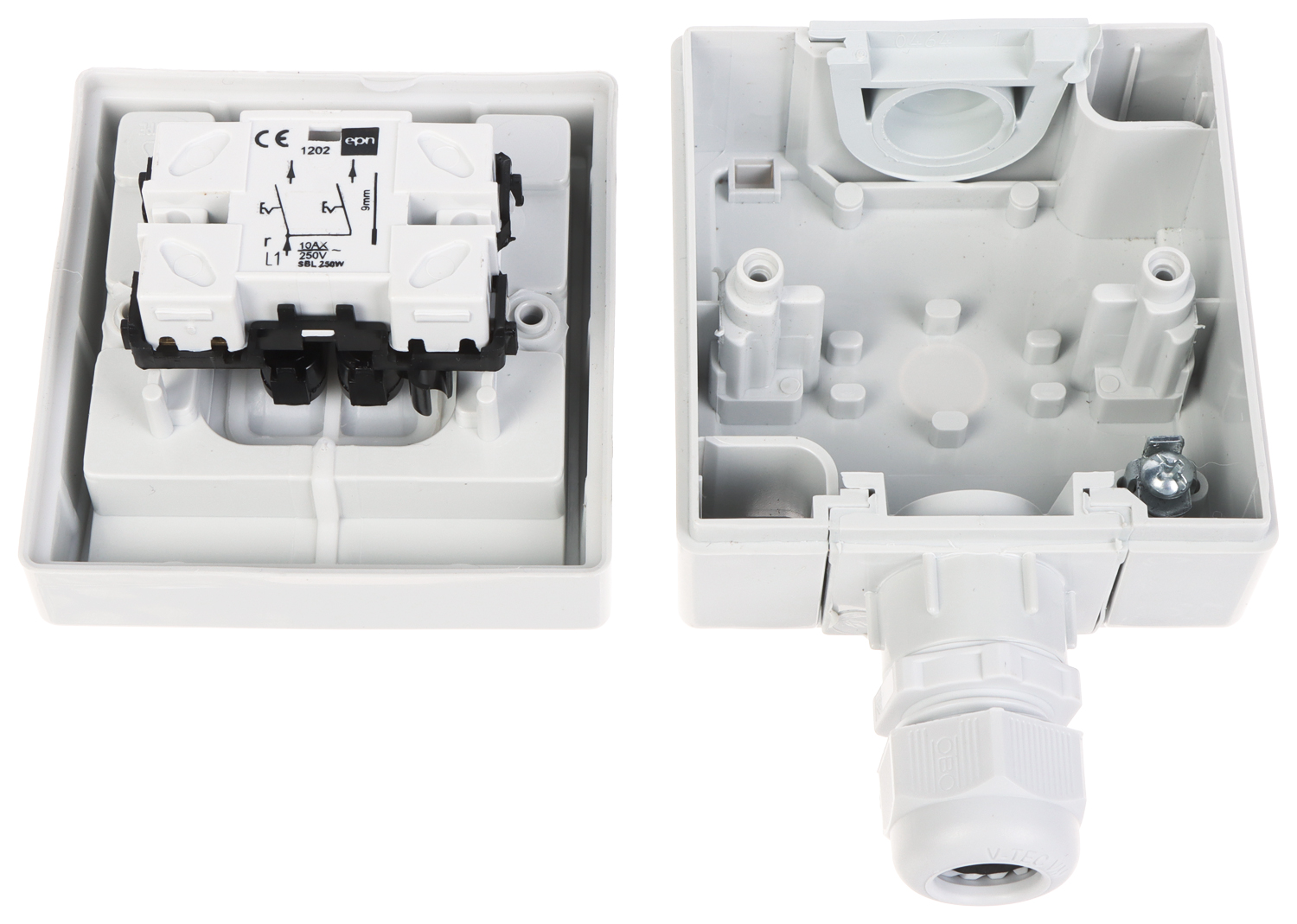 Ierīces veids: Dubultais pārslēdzis Nominālais spriegums: 250 V AC Nominālā strāva: 10 A (induktīvā slodze) Savienotāju veids: skrūvējama plāksne Krāsa: Pelēks + Tumši pelēks
