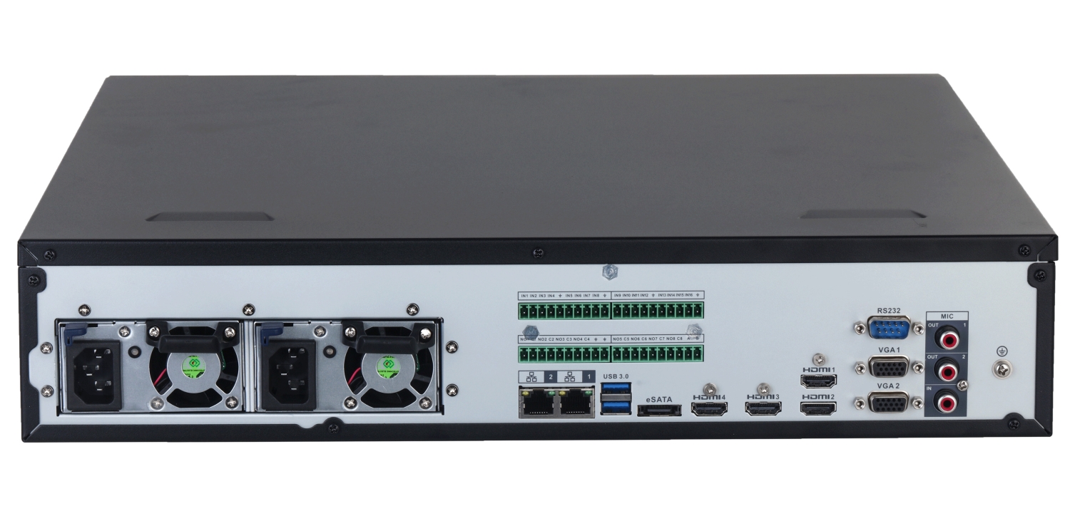 Tīkla video ierakstītājs aprīkots ar advancētu attēla analīzes funkciju; Atbalstītā izšķirtspēja: max. 32 Mpx Audio atbalsts: 64 Kanāli – Audio no kamerām, Audio ieeja: 1 gab. CINCH Audio izeja: 2 gab. CINCH Attēla kompresijas metode: Smart H.265+ Atbalstītie cietie diski: 8 x 16 TB SATA + 1 x eSATA, Raid 0/1/5/6/10 Avārijsignalizācijas ieejas / izejas: 16 / 8 Izvēlētās funkcijas: Inteliģenta attēla analīze, veido detekcija, Sejas atpazīšana Energoapgādes avots: Rezerves barošanas avots