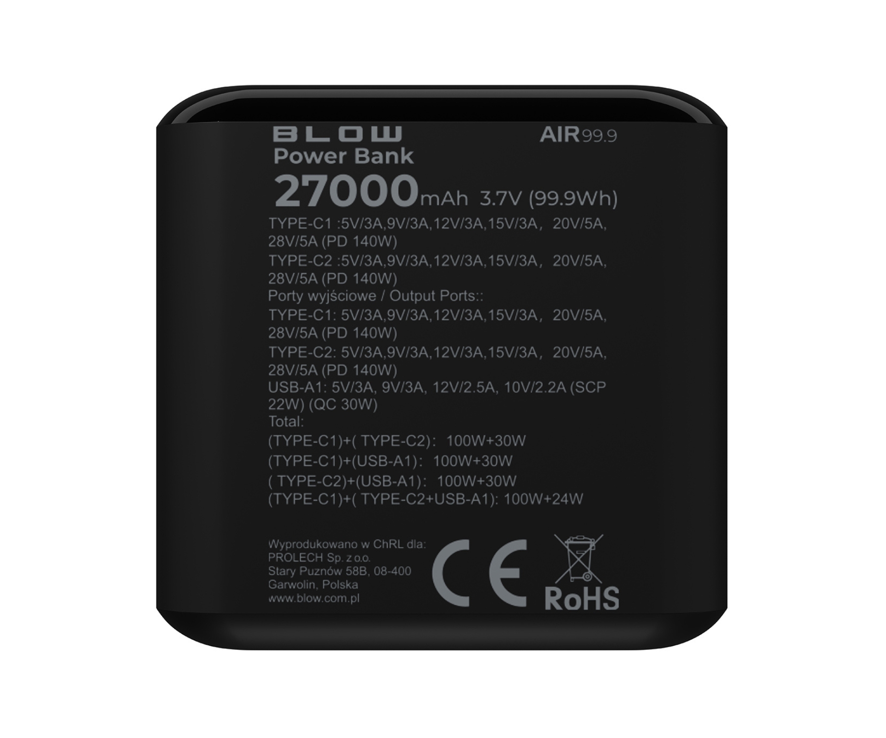 Akumulatora tilpums: 27000 mAh Maksimālā slodzes jauda: 140 W Ieeju skaits: 2 x USB-C Izeju skaits: 1 gab. USB-A – Quick Charge 3.0, 2 gab. USB-C – Power Delivery