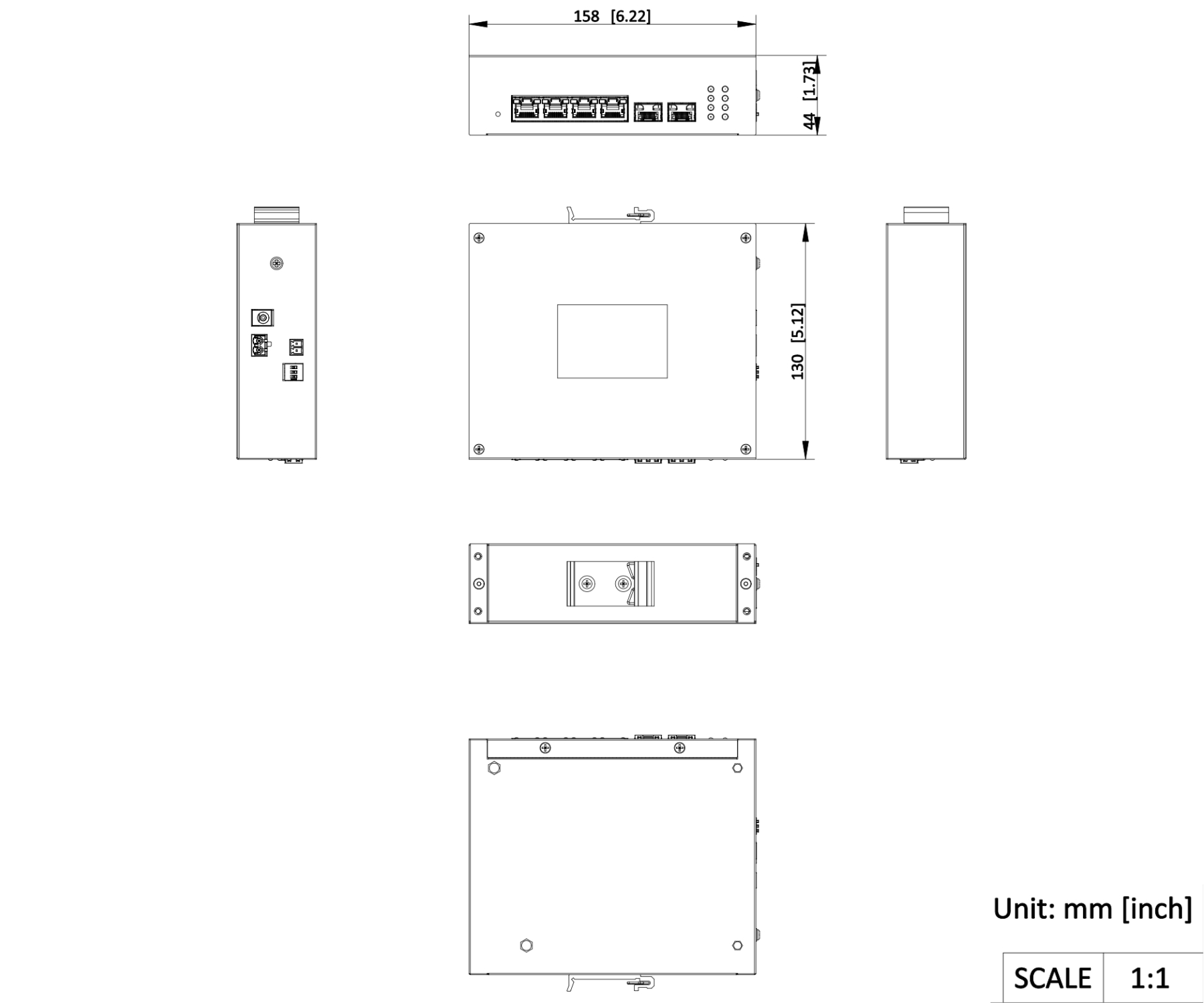 LAN porti: 4 x RJ45 ( 1 ligzda – PoE (802.3af/at/bt) + 2 … 4 porti – PoE (802.3af/at) + 3 … 4 porti – Passive PoE ( 24 V / 54 V ) ), 2 x SFP ligzda Pārraides ātrums: 10 / 100 / 1000 Mbps – 4 LAN & PoE porti, 1000 Mbps – 2 SFP porti – Uplink Maksimāla kopējā jauda: 110 W @ 54 V 60 W @ 12 … 24 V PārvaldībaIzvēlētās īpašības: Montāža uz DIN sliedes