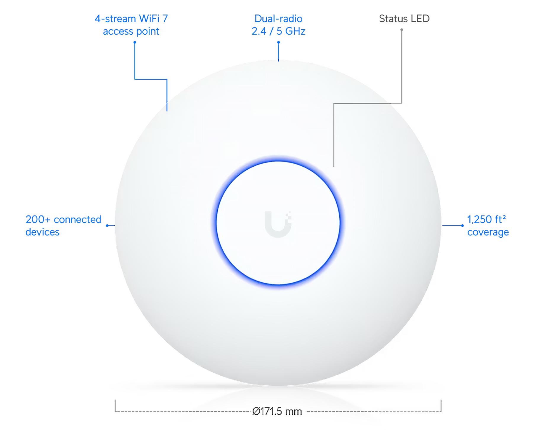 4 telpiskās plūsmas Atbalsts Mesh tehnoloģijai Virspuses segums : 115 m² Viegla un vienota pārvaldes sistēma vairākām ierīcēm Android: Bezmaksas aplikācija UniFi iOS (iPhone): Bezmaksas aplikācija UniFi Montāžas iespēja pie sienas vai griestiem Intuitīva instalācija un vairāku advancētu funkciju konfigurācija WiFi4/WiFi5/WiFi6/WiFi7 atbalsts MU-MIMO – daudzantenu pārraides funkcija caurlaides spējas palielināšanai un savienojuma uzticamībai ar tīkla klientu max 8 adreses BSSID katrai joslai Tīkls viesiem – atsevišķs un drošs tīkls viesiem QoS – Caurlaidspējas kontrole > 200 on-line lietotāji |
