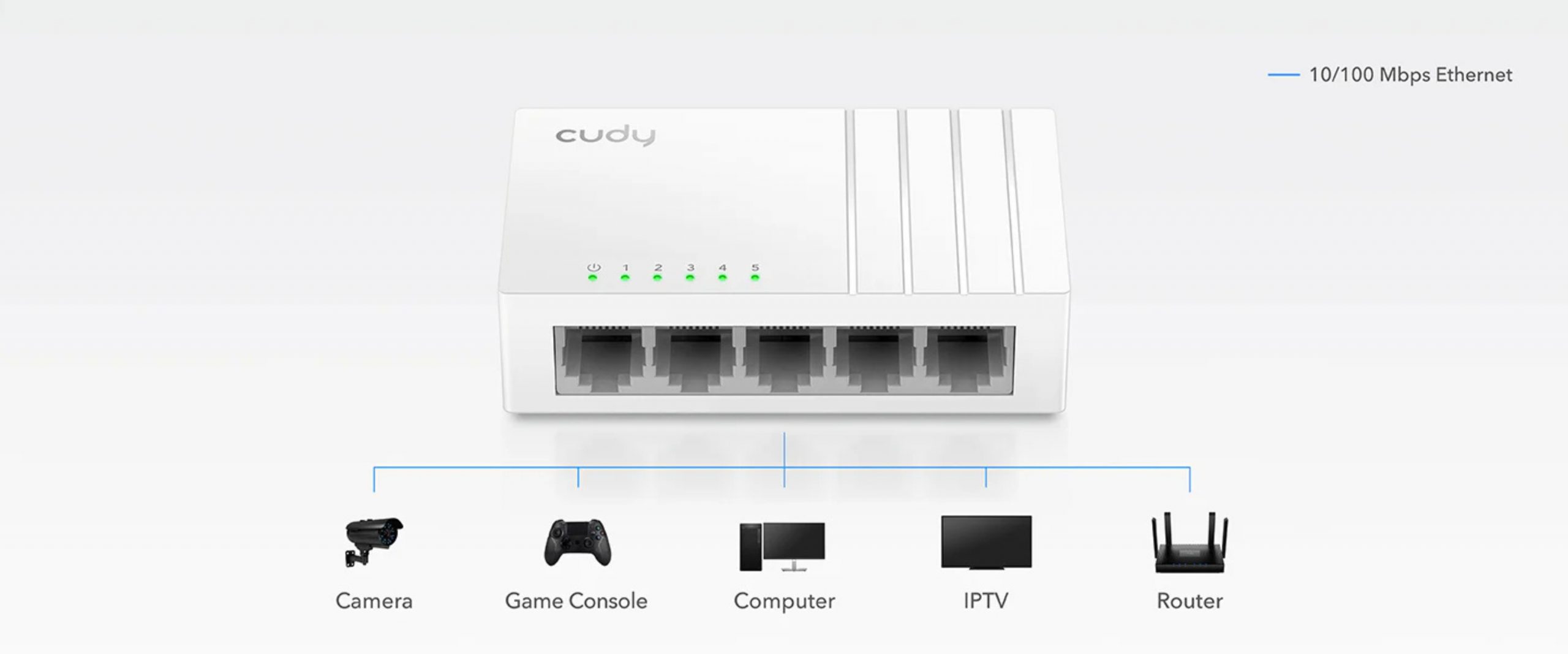 LAN porti: 5 x 10 / 100 Mbps Pārraides ātrums: 10 / 100 Mbps, 5 LAN porti