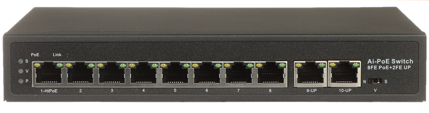 | Darba režīms: | N – Normal – ierīce darbojas kā normāls PoE switch V – VLAN (Port Isolation) – 1 … 8 ports are isolated from each other and separately work with the 9, 10 ports S – Extend – Uztveršanas zona : 250 m @ 10 Mbps |