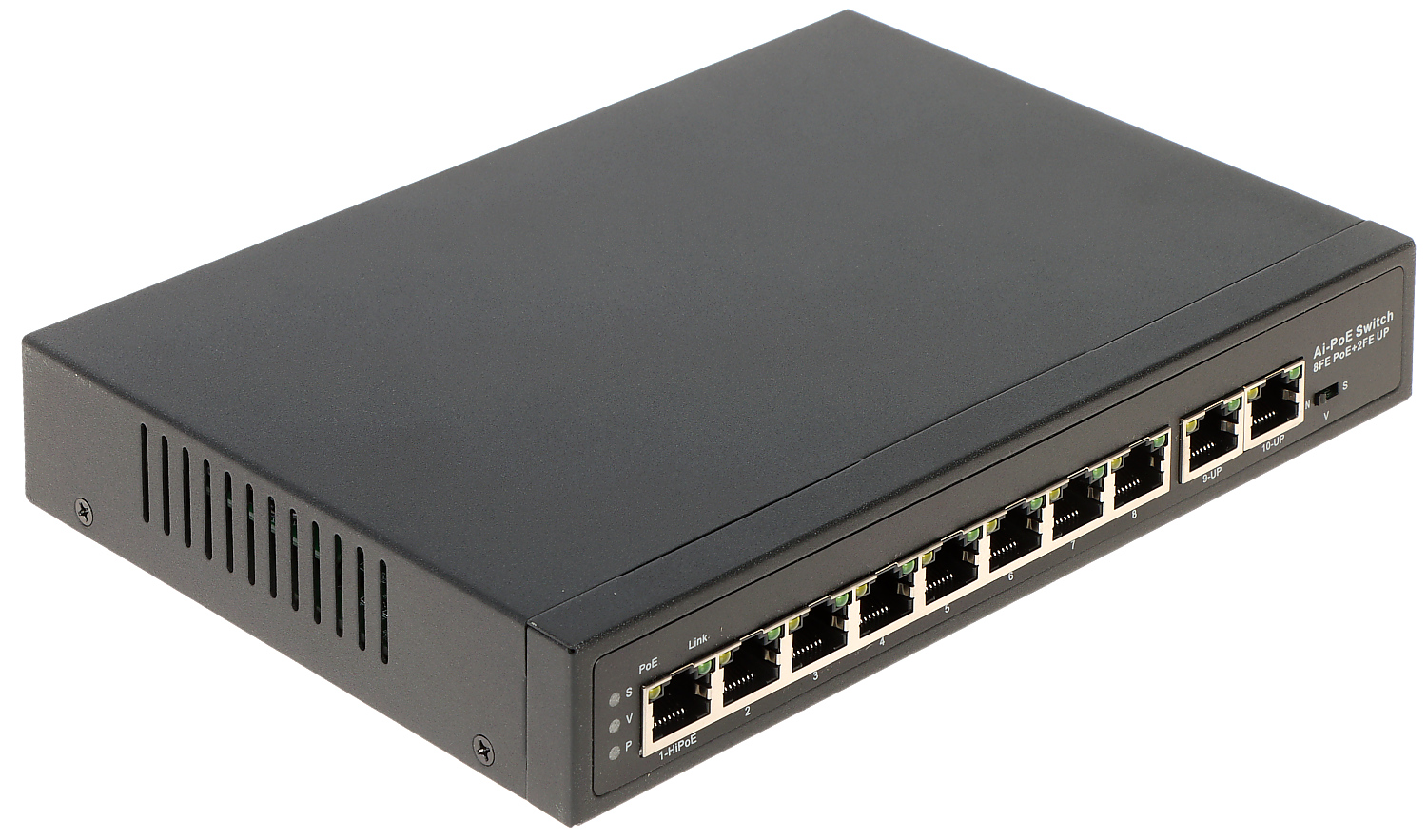 | Pārraides ātrums: | 10 / 100 Mbps : 2 x LAN ports – Uplink + 8 x LAN & PoE ports |