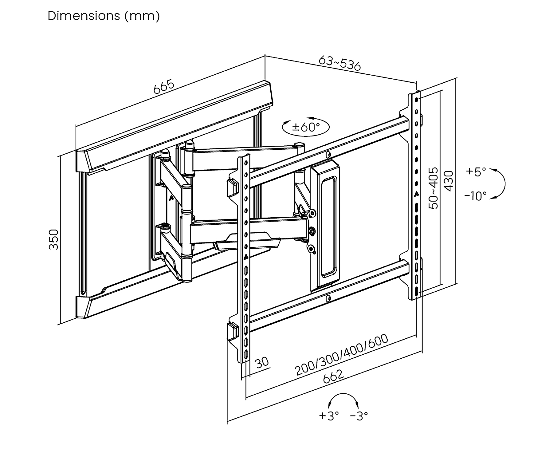 Ekrāna izmērs collās: 37 " … 80 " Slogojamība: 60 kg Attālums no montāžas virsmas: 63 … 536 mm