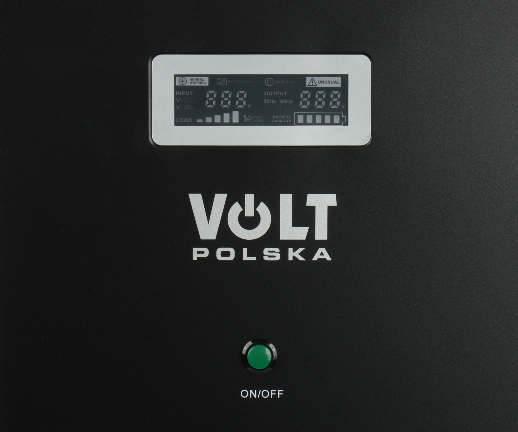 LED displejs : Darba režīms, Avārijas signalizācija, Pārslodzes signalizācija, Darba slodze, Akumulatora uzlādes līmenis, Ieejas spriegums, Izejas spriegums, Strāvas frekvence – Izeja |