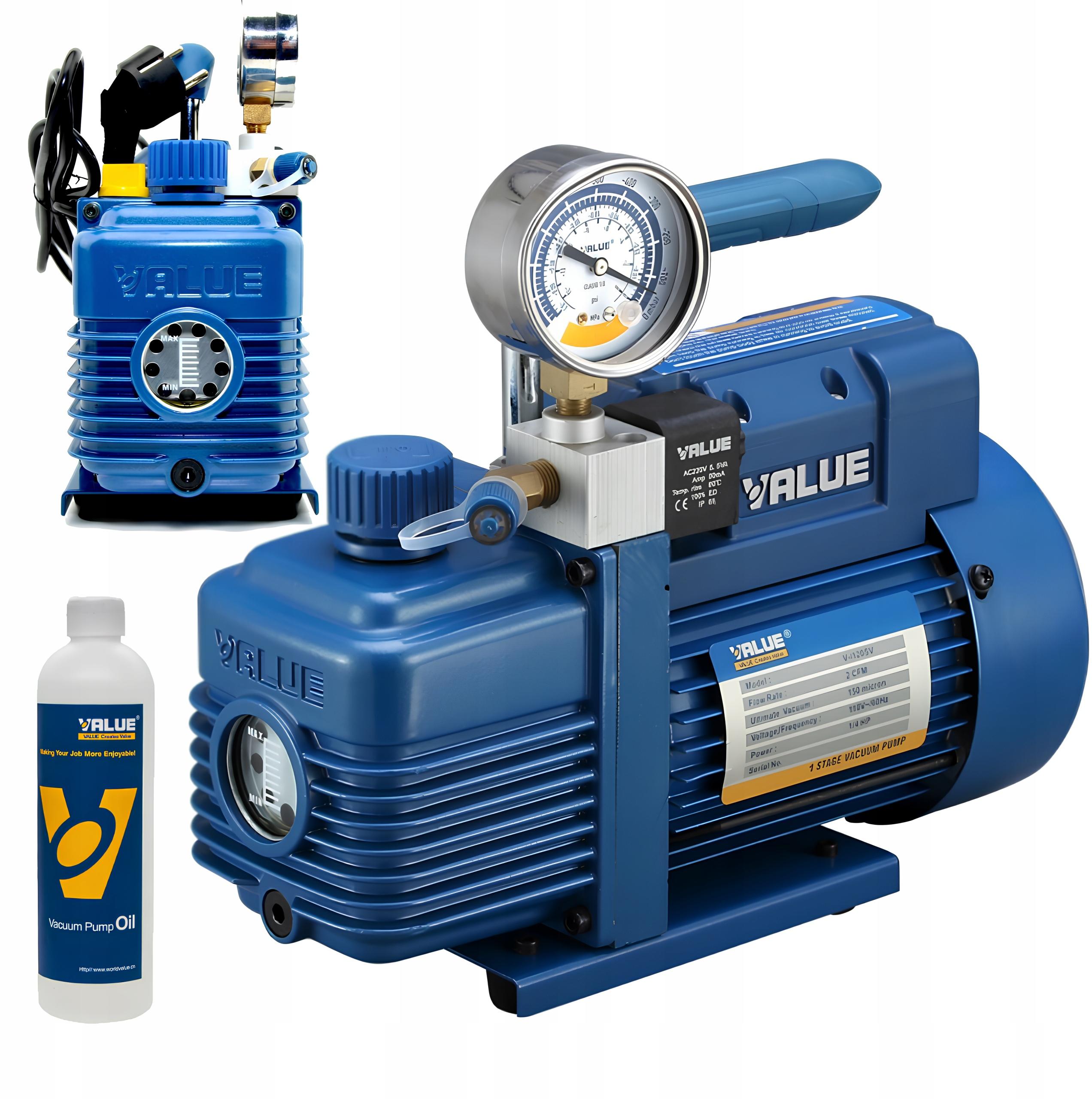 vienpakāpes vakuumsūknis ar labi zināmu un cienījamu zīmolu VALUE, kas paredzēts darbam ar HFC un HCFC dzesētājiem (aukstumaģentiem R10A.). R407C).
