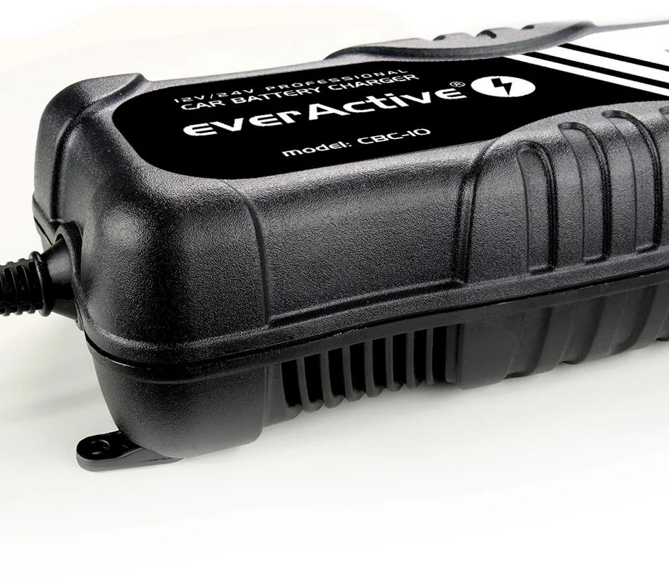 - Интеллектуальное зарядное устройство с процессором everActive CBC-10 разработан для популярных аккумуляторов 12 В и 24 В.