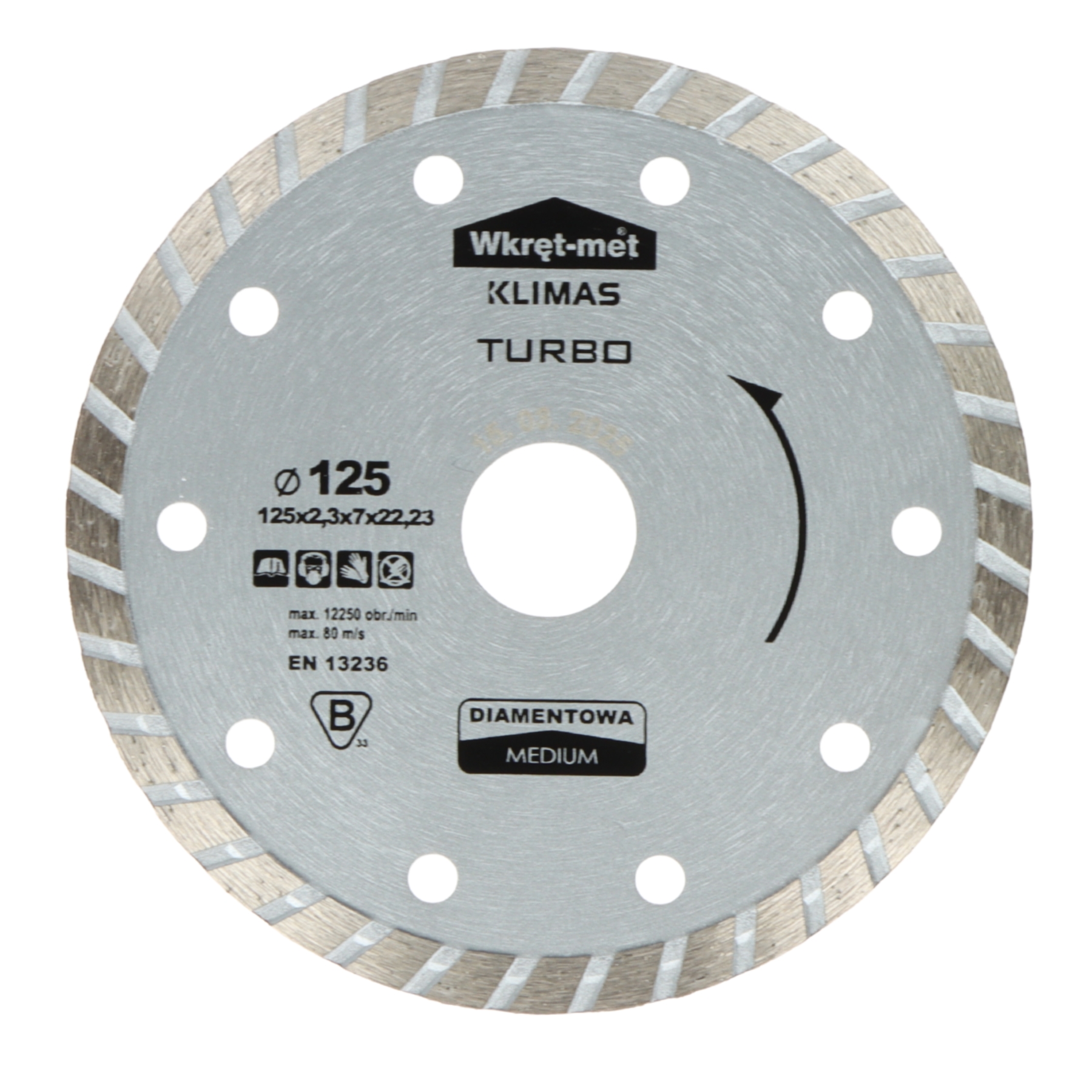 Приложение: Betona, flīžu, ķieģeļu, dobu mūra elementu, dabīgā akmens griešanai. Диаметр диска: 125 мм Diska biezums: 2.3 mm Диаметр монтажного отверстия: 22.23 mm Maksimālais apgriezienu skaits minūtē: 12250 RPM Масса: 119 g