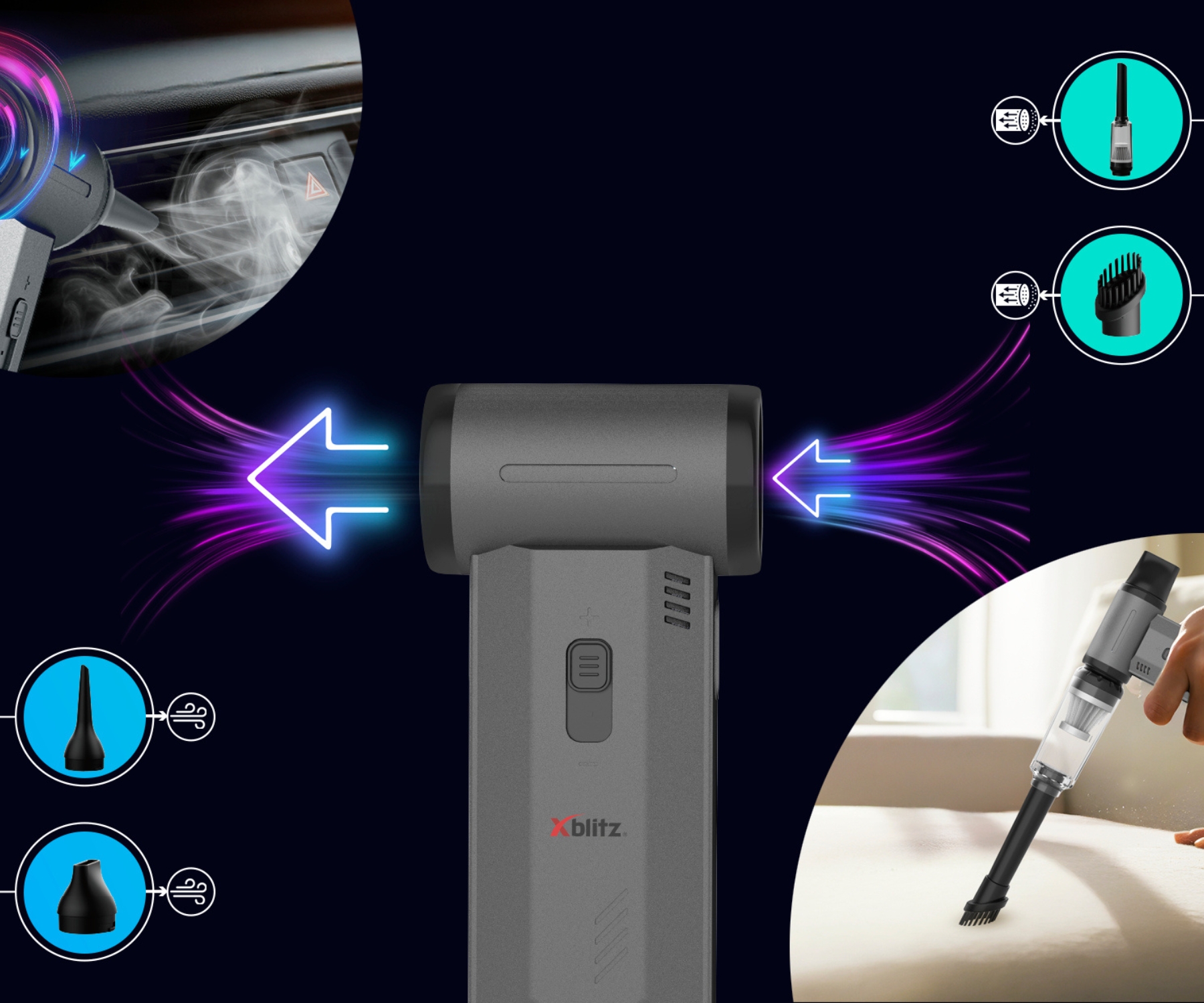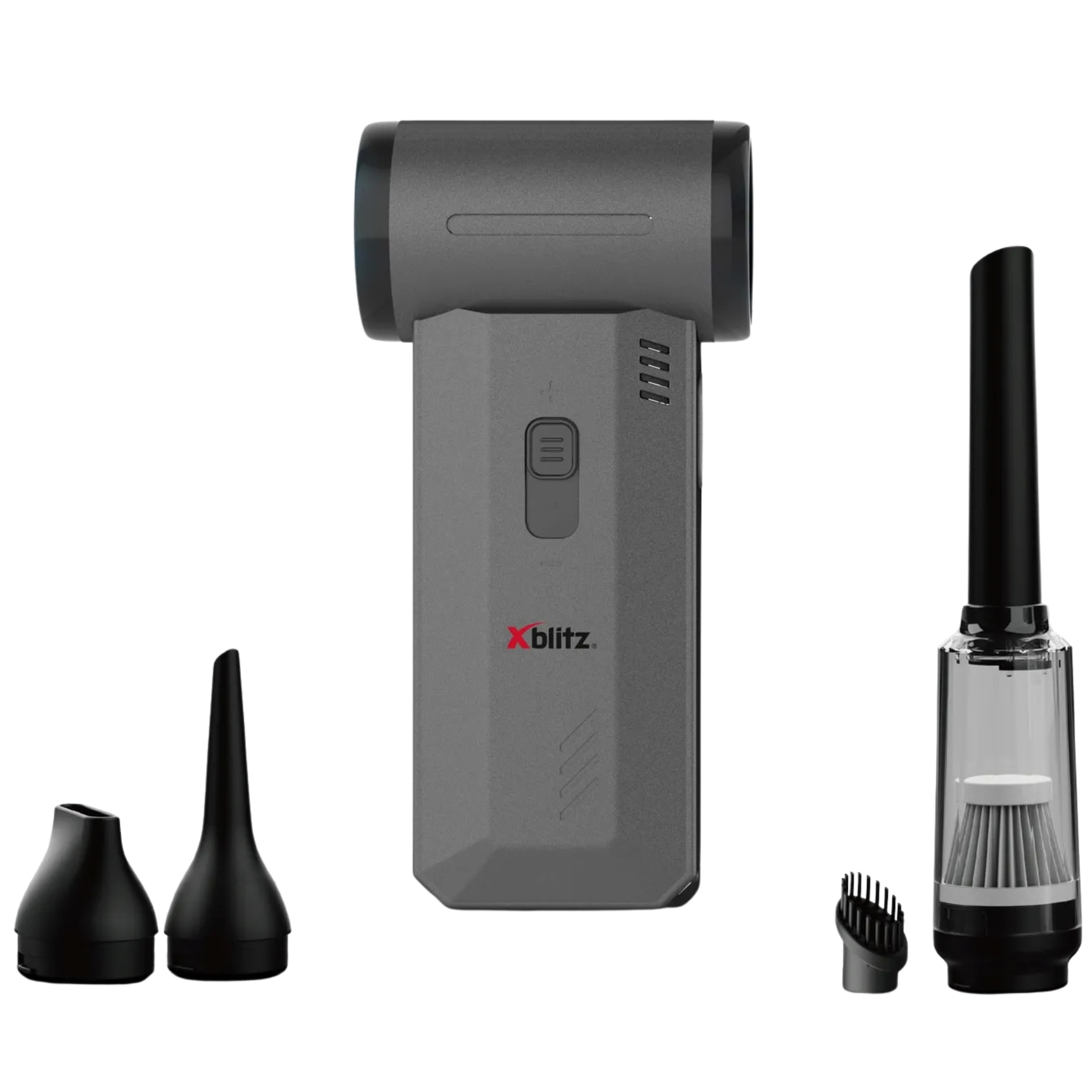Xblitz Dragon – kompakta 2-in-1 ierīce putekļu sūcējam un pūtējam. Aprīkots ar 200 W bezsuku motoru un četriem uzgaļiem (caurule, birste, īsais un garais uzgalis), tas ļauj efektīvi tīrīt gan polsterējumu vai automobiļa interjeru, gan delikātas virsmas – tastatūru, ventilatoru vai kameru.; Скорость вращения: 60 000 … 130 000 RPM Избранные функции: Bezsuku motors, Bezgalīgi mainīga ātruma regulēšana Аккумулятор: 8000 mAh Li-Ion Типичное время зарядки аккумулятора: max. 3 h Часы работы: 12 … 120 min