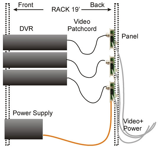 Корпус панели оснащён специальными отверстиями для кабельных стяжек, которые не позволяют выдернуть кабели даже при большом усилии. Сигнал выводится по кабелям BNC на приёмные устройства, такие как цифровые регистраторы, мониторы или матричные коммутаторы. Глубина панели очень мала, поэтому она подходит для установки как на передние, так и на задние направляющие RACK. Во втором случае все соединения остаются в задней части шкафа, что повышает эстетичность всей инсталляции. Встроенный дополнительный фильтр усиления высоких частот компенсирует потери в кабеле, улучшая качество изображения.