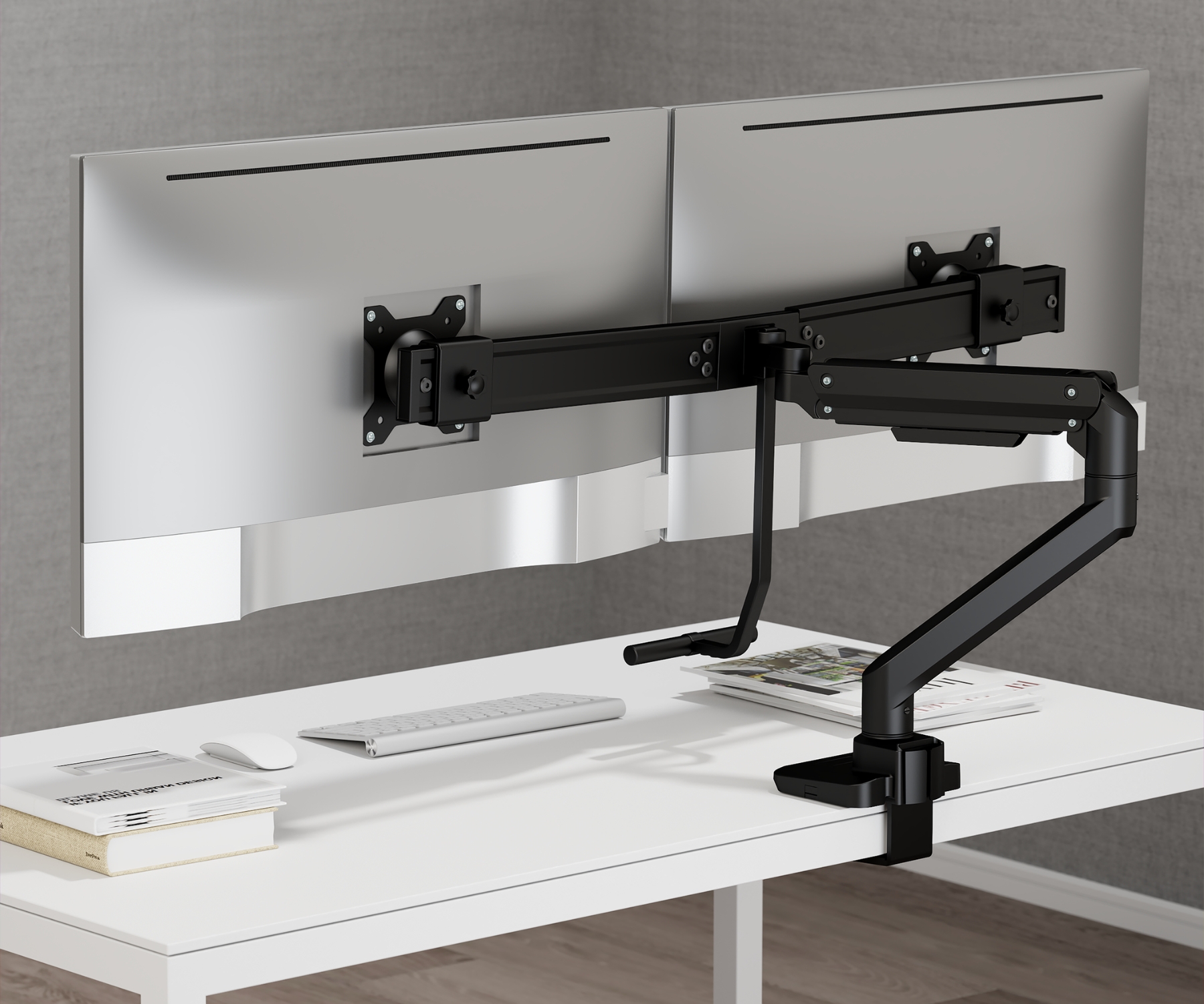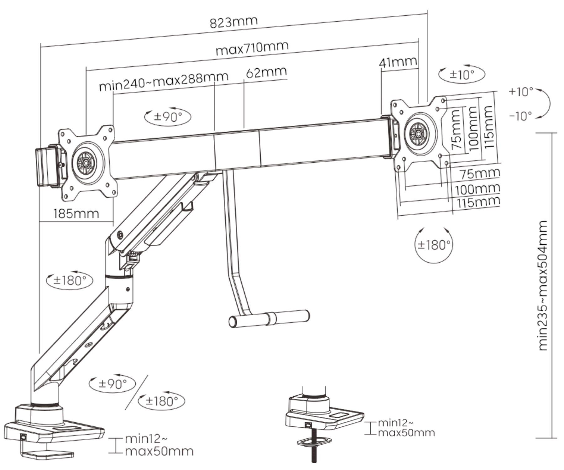 Gāzes atspere nodrošina vienmērīgu un brīvu regulēšanu visos virzienos Gāzes atsperes regulēšana palīdz pielāgot atsperes darbību monitora svaram Nostiprināšana pie 12-50 mm biezas darba virsmas Крепление в проеме рабочей поверхности Kabeļu vadības sistēma ļauj tos noslēpt stiprinājuma iekšpusē |